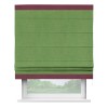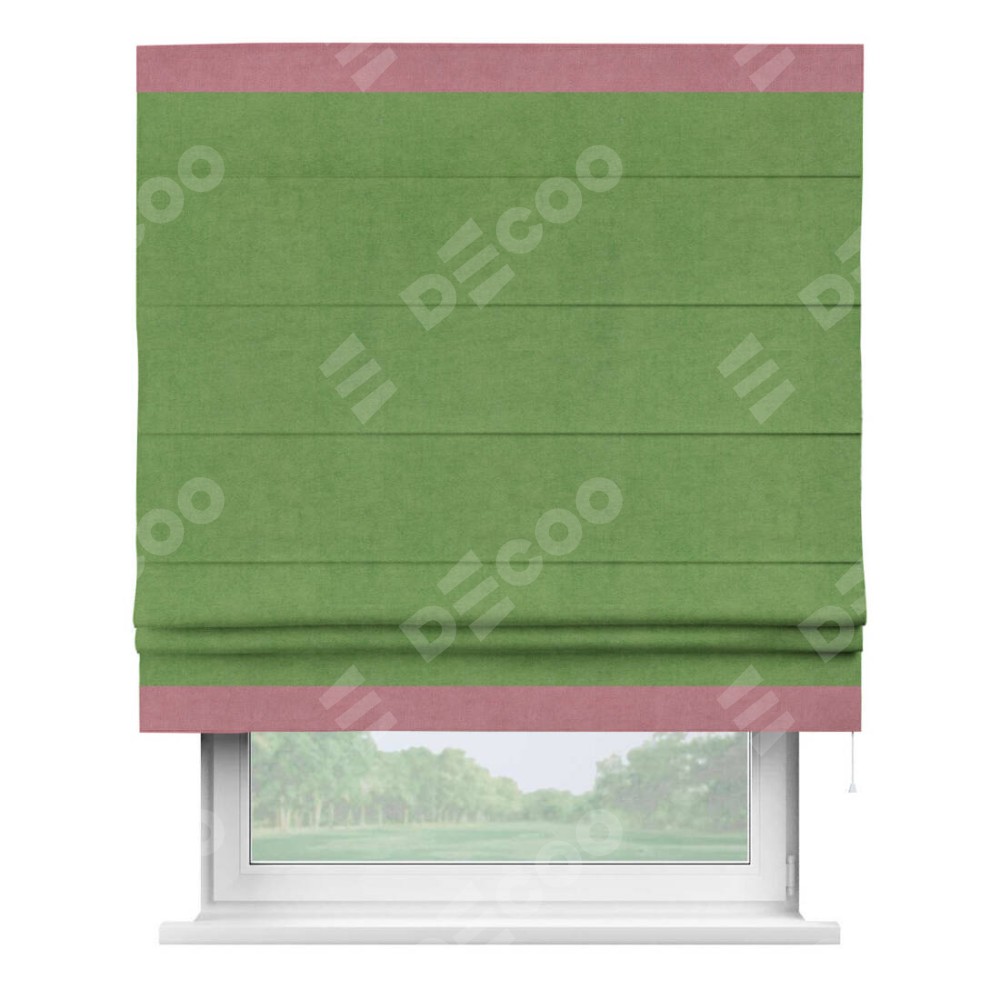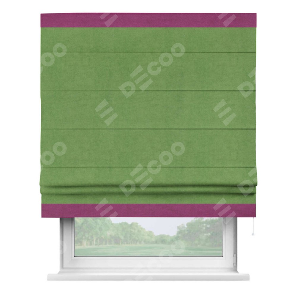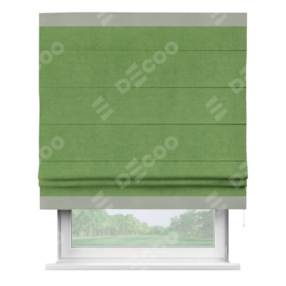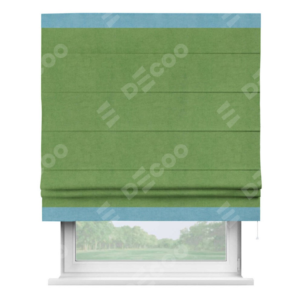 Римская штора производителя «Cortin», используется для проёма, пошита из ткани вельвет салатовый, артикул ткани 87072. Отделка шторы кантом «Горизонт», ткань для канта используется из вельвета разной расцветки на выбор. Имеет универсальный механизм и подходит для монтажа: на потолок, на стену и в нишу.