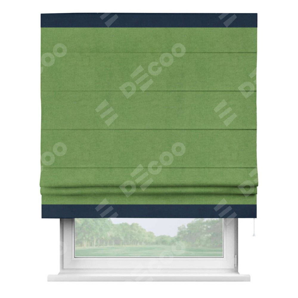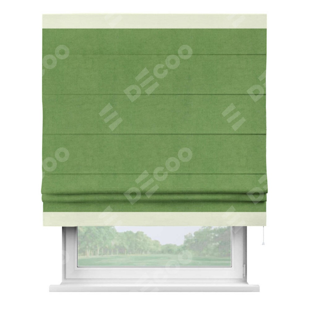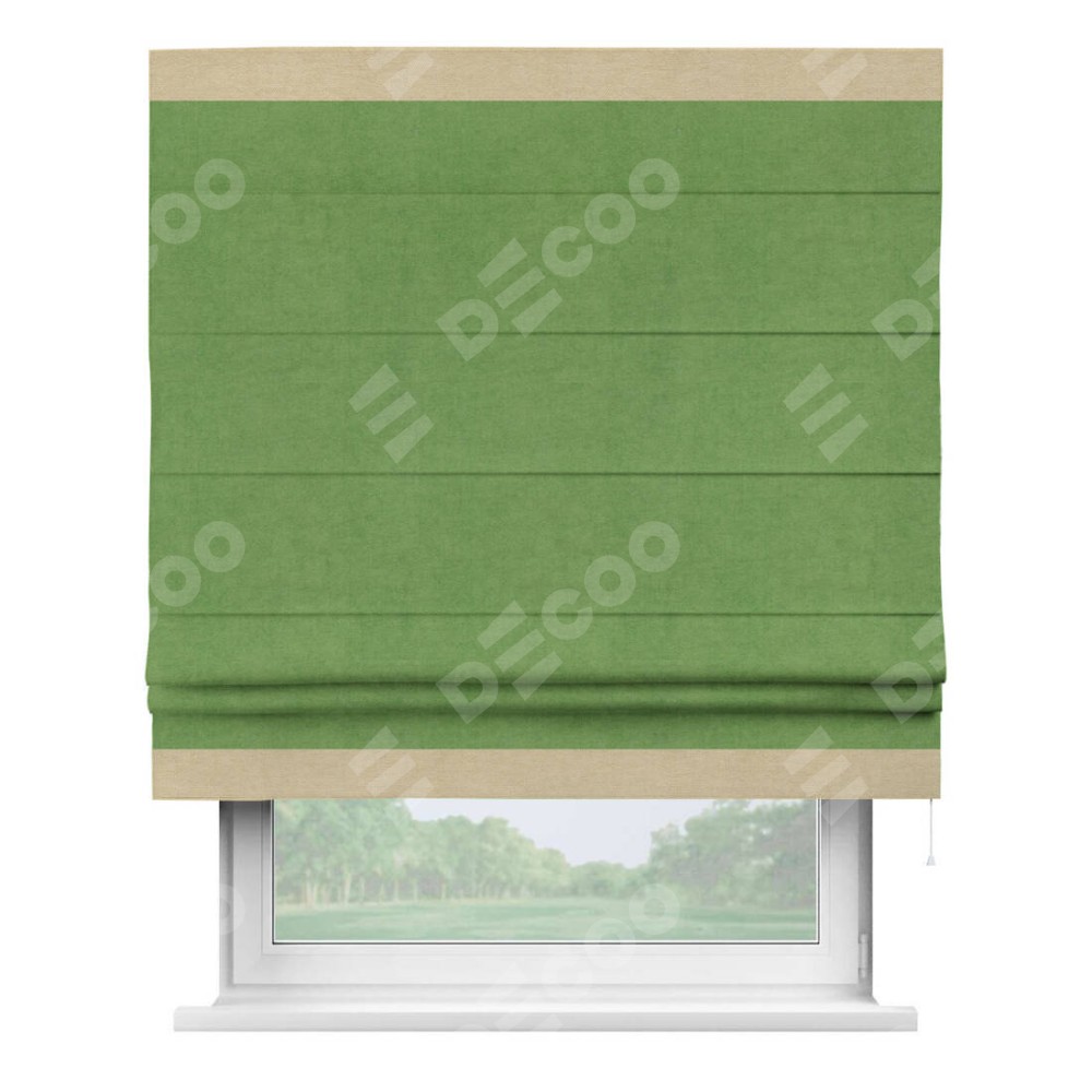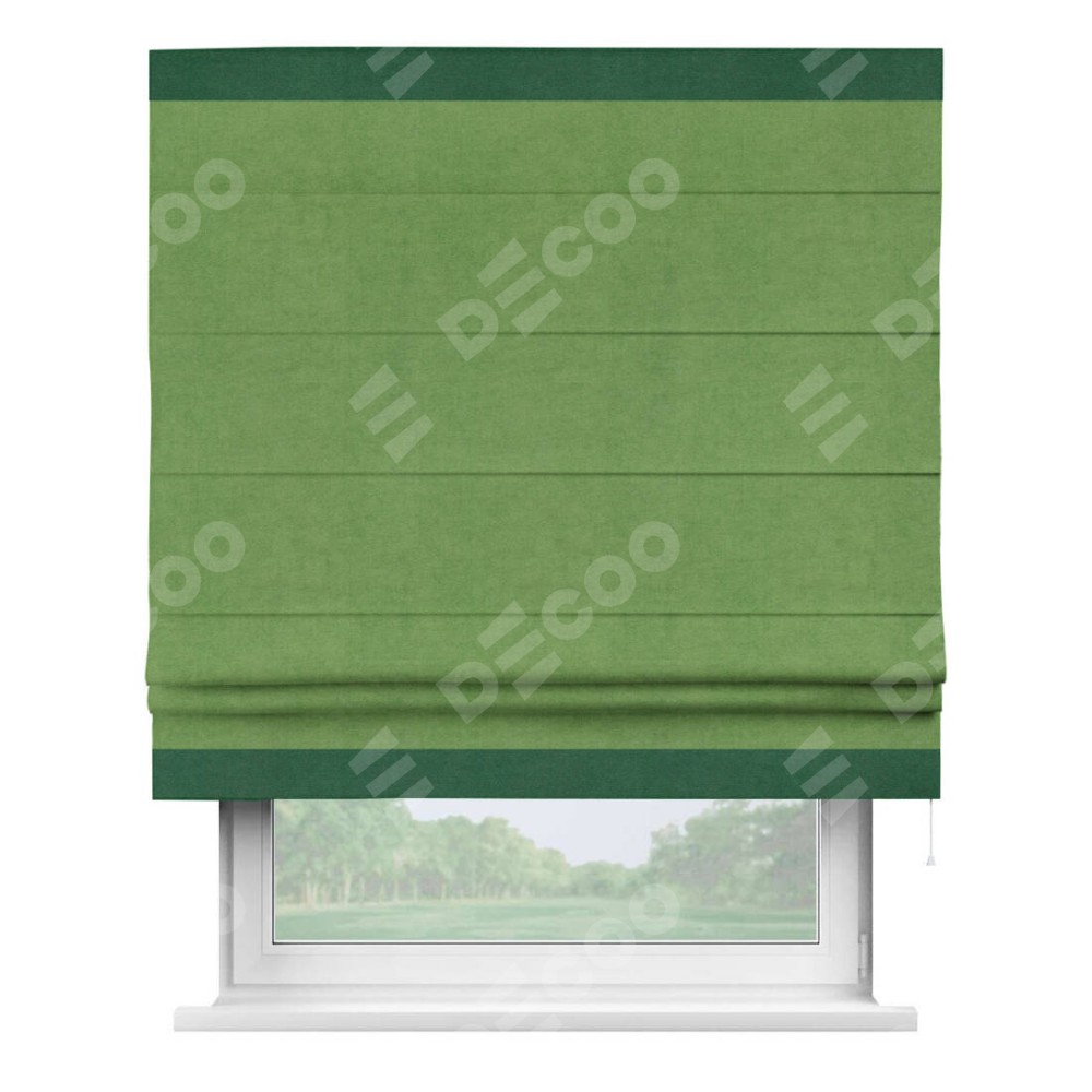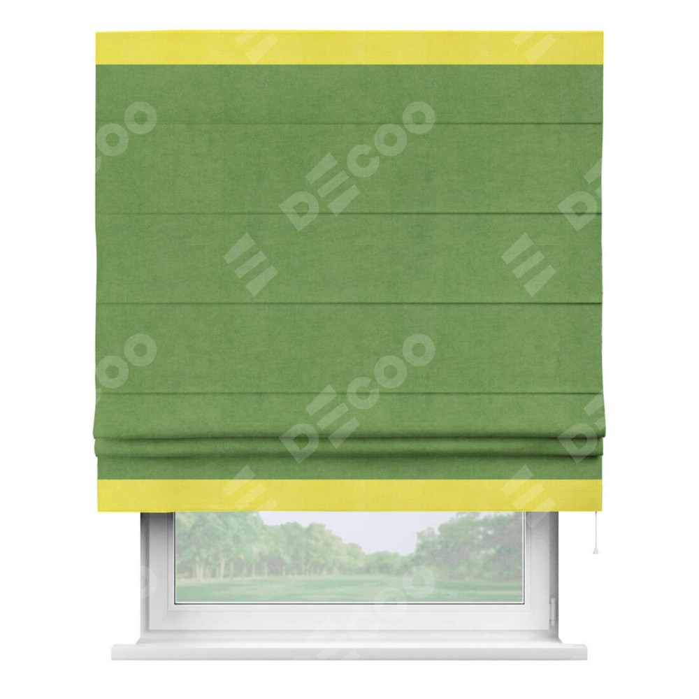 Римская штора производителя «Cortin», используется для проёма, пошита из ткани вельвет салатовый, артикул ткани 87072. Отделка шторы кантом «Горизонт», ткань для канта используется из вельвета разной расцветки на выбор. Имеет универсальный механизм и подходит для монтажа: на потолок, на стену и в нишу.