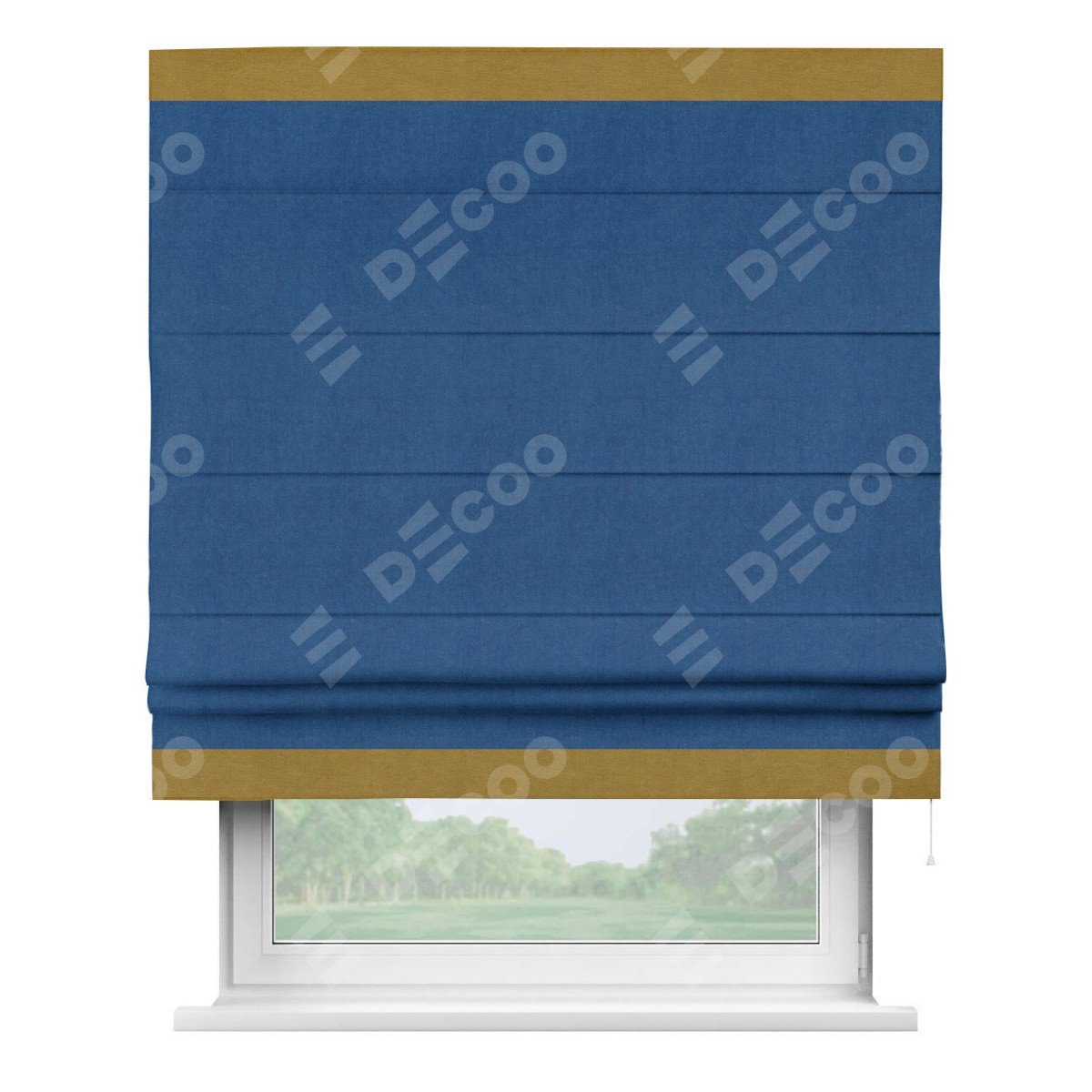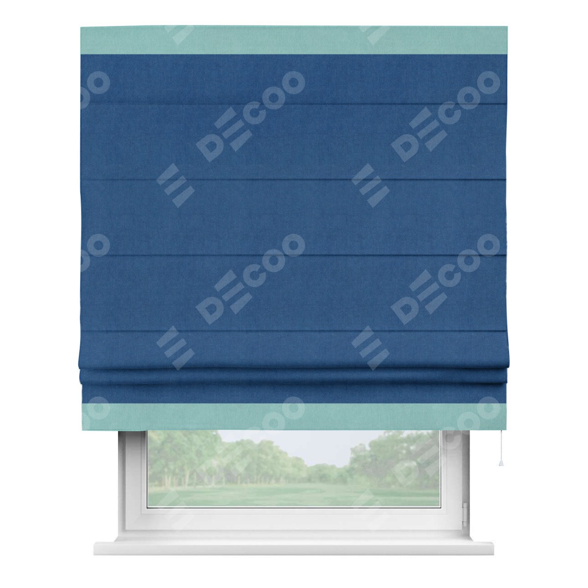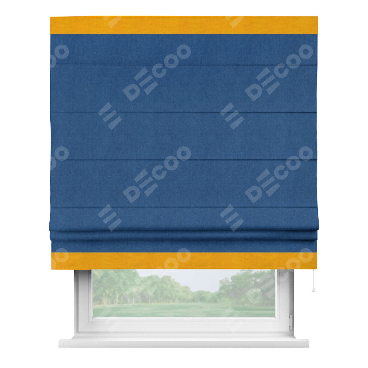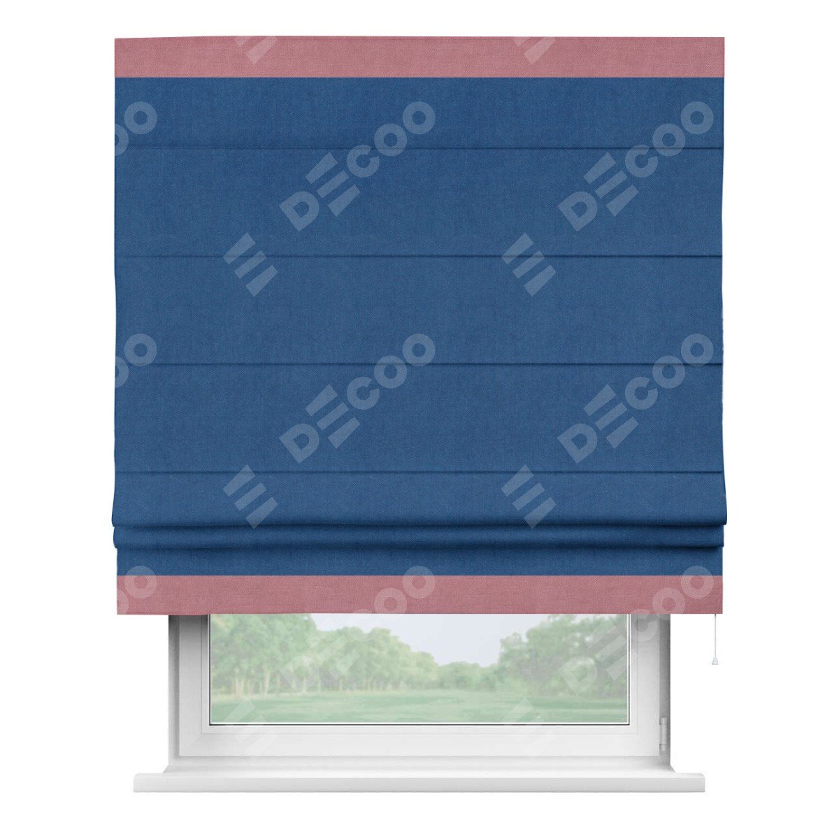 Римская штора производителя «Cortin», используется для проёма, пошита из ткани вельвет синий, артикул ткани 85554. Отделка шторы кантом «Горизонт», ткань для канта используется из вельвета разной расцветки на выбор. Имеет универсальный механизм и подходит для монтажа: на потолок, на стену и в нишу.