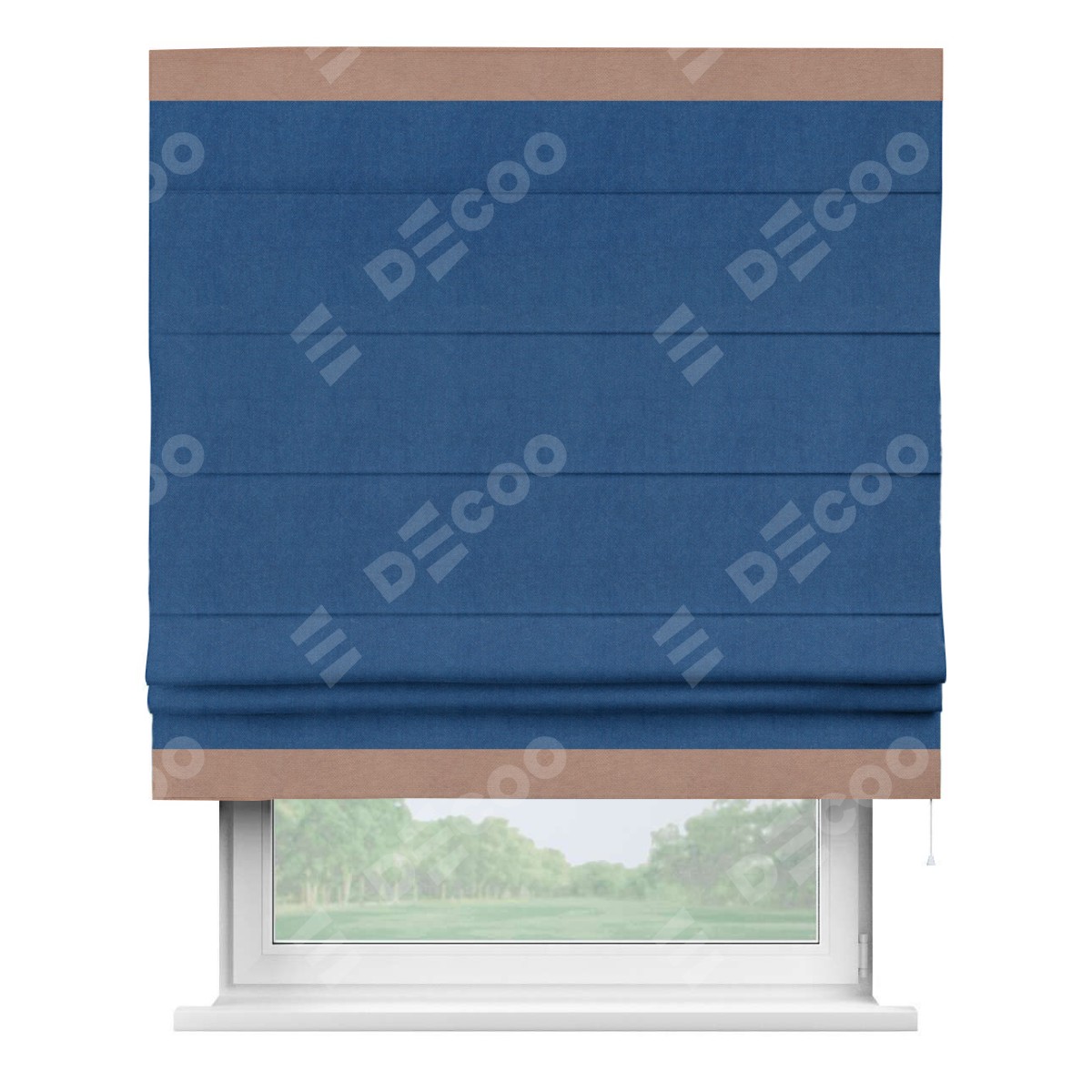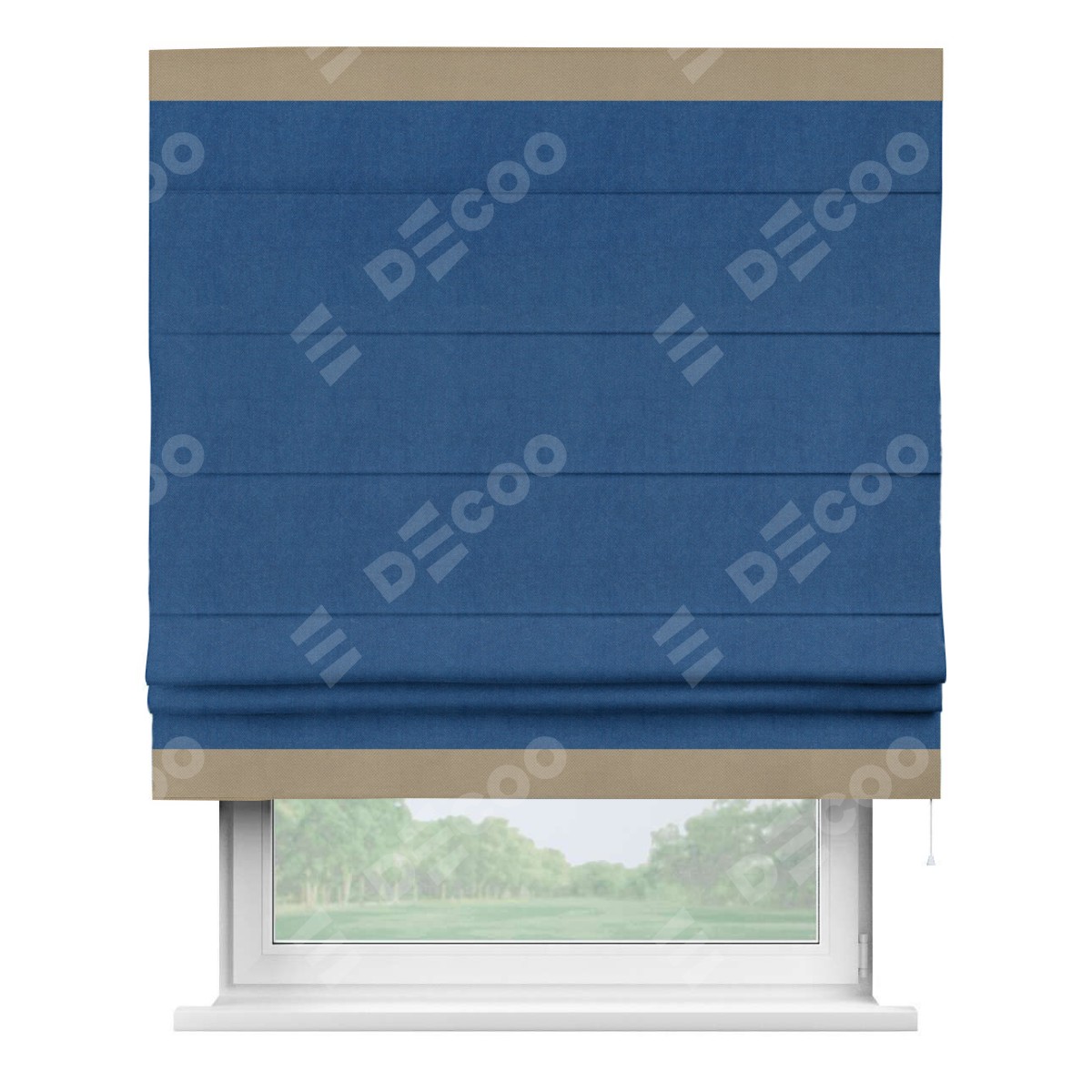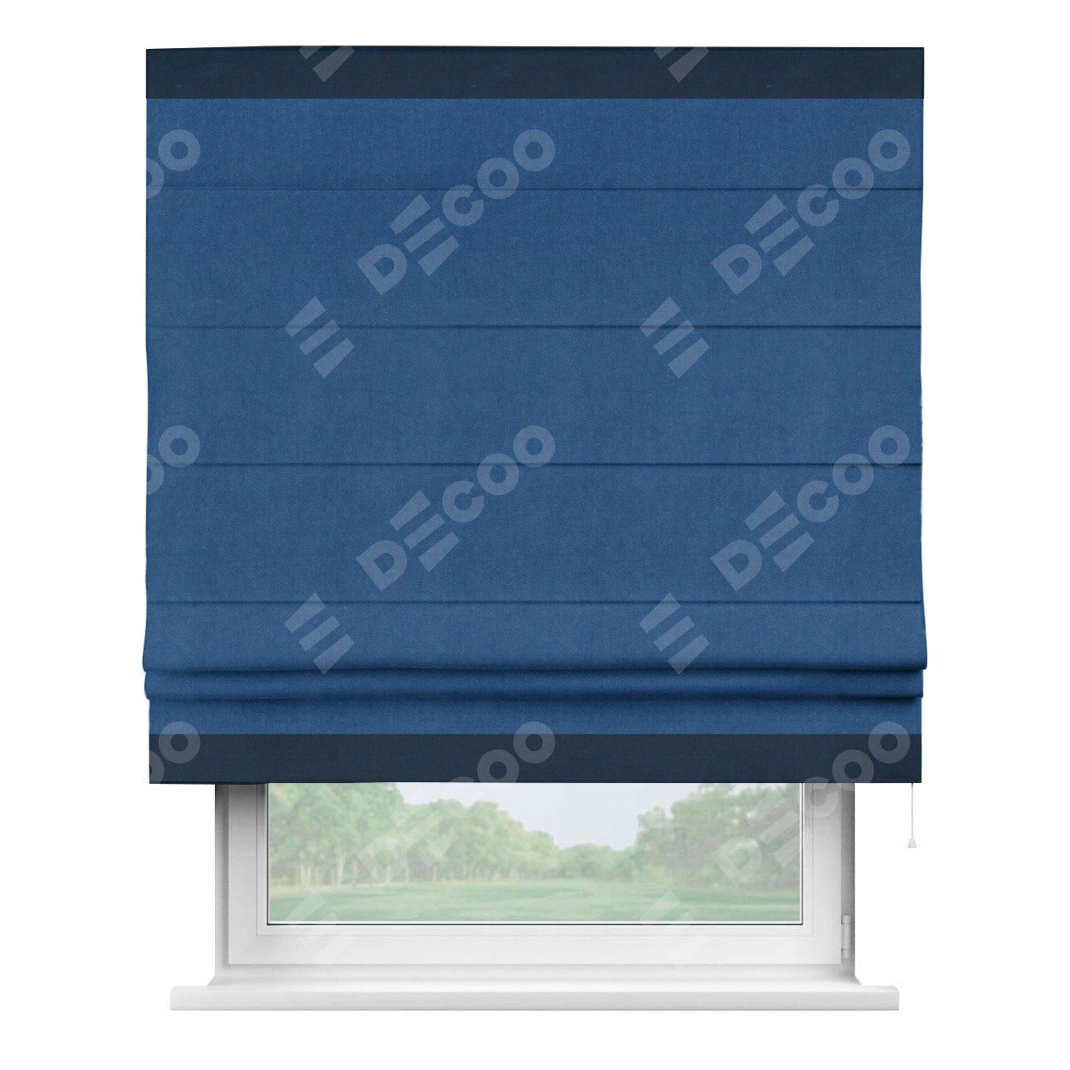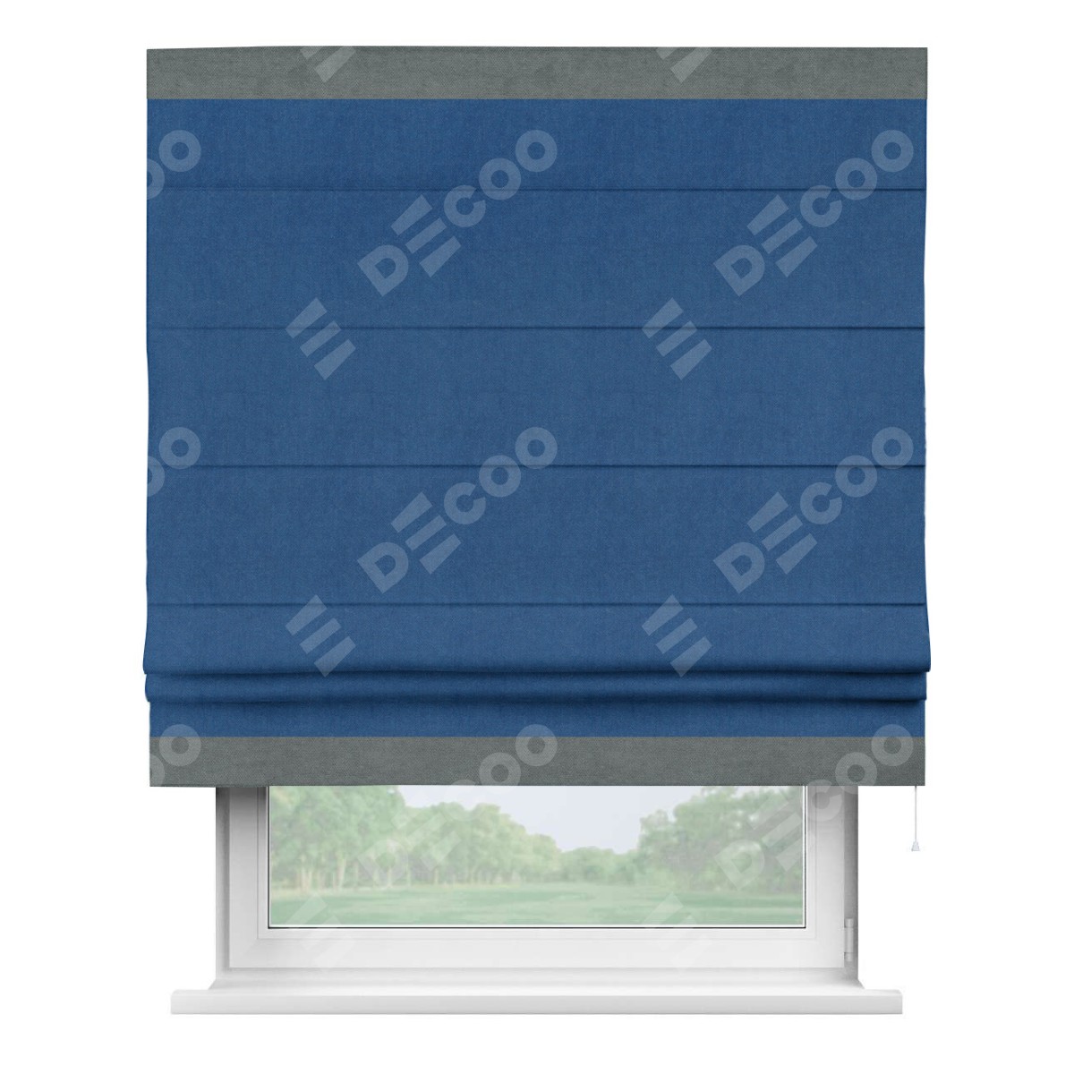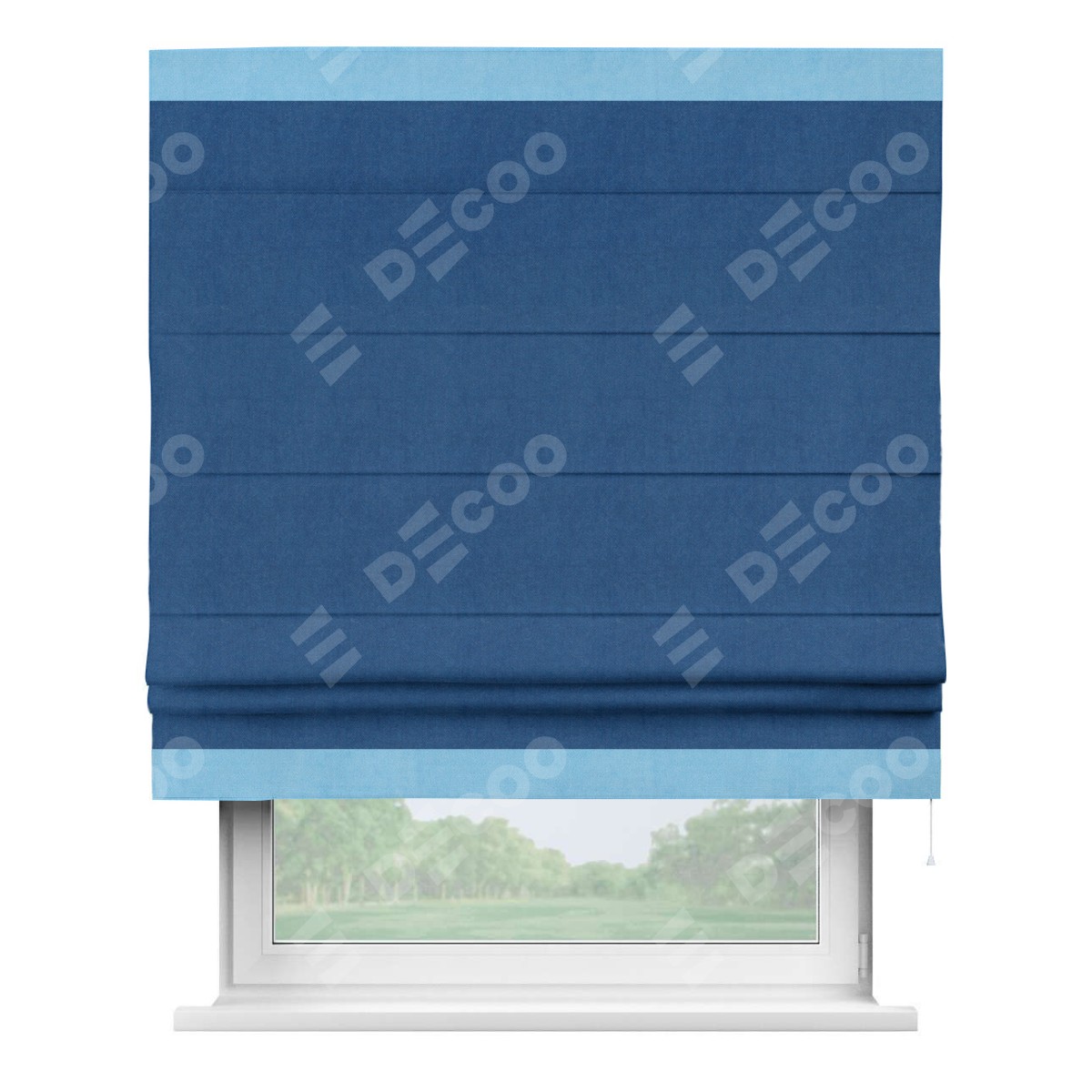 Римская штора производителя «Cortin», используется для проёма, пошита из ткани вельвет синий, артикул ткани 85554. Отделка шторы кантом «Горизонт», ткань для канта используется из вельвета разной расцветки на выбор. Имеет универсальный механизм и подходит для монтажа: на потолок, на стену и в нишу.