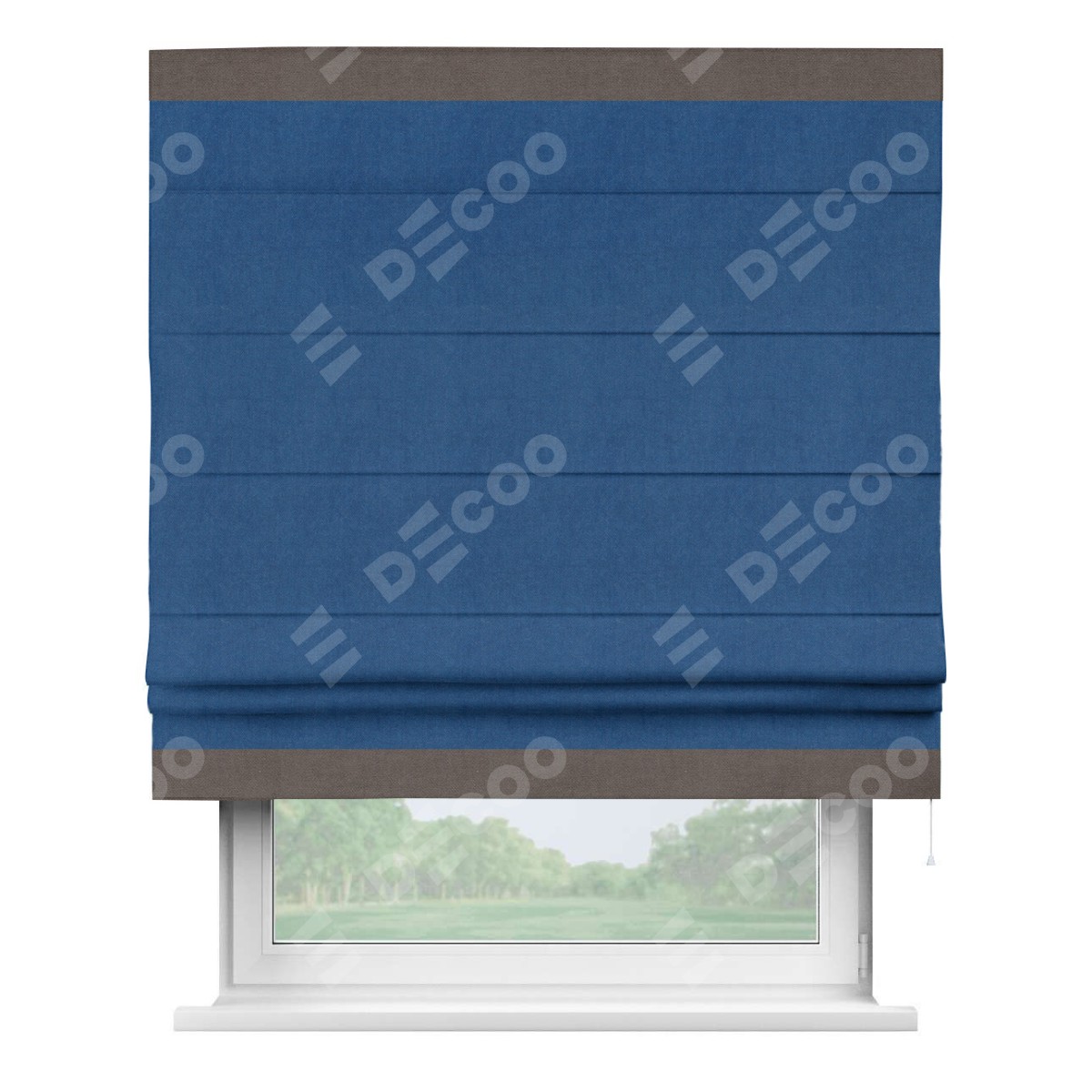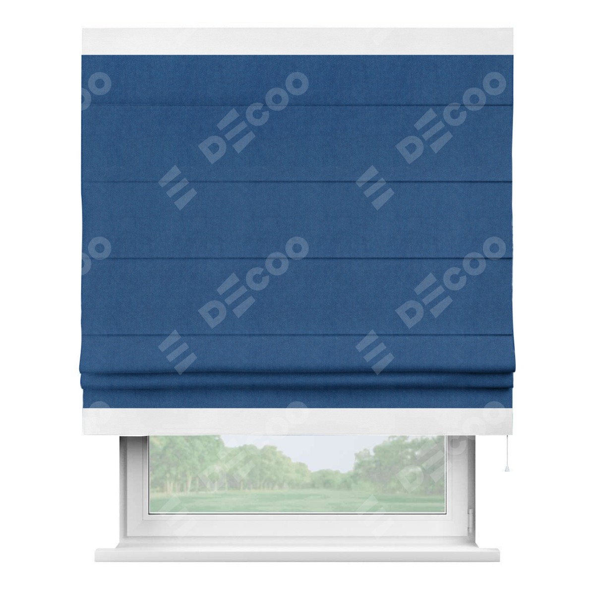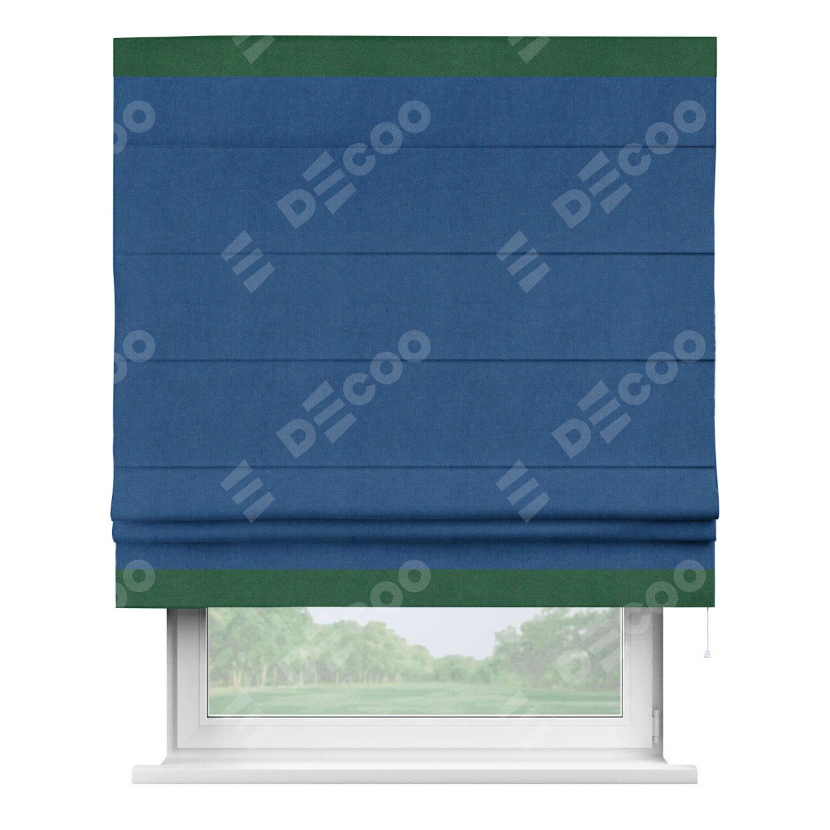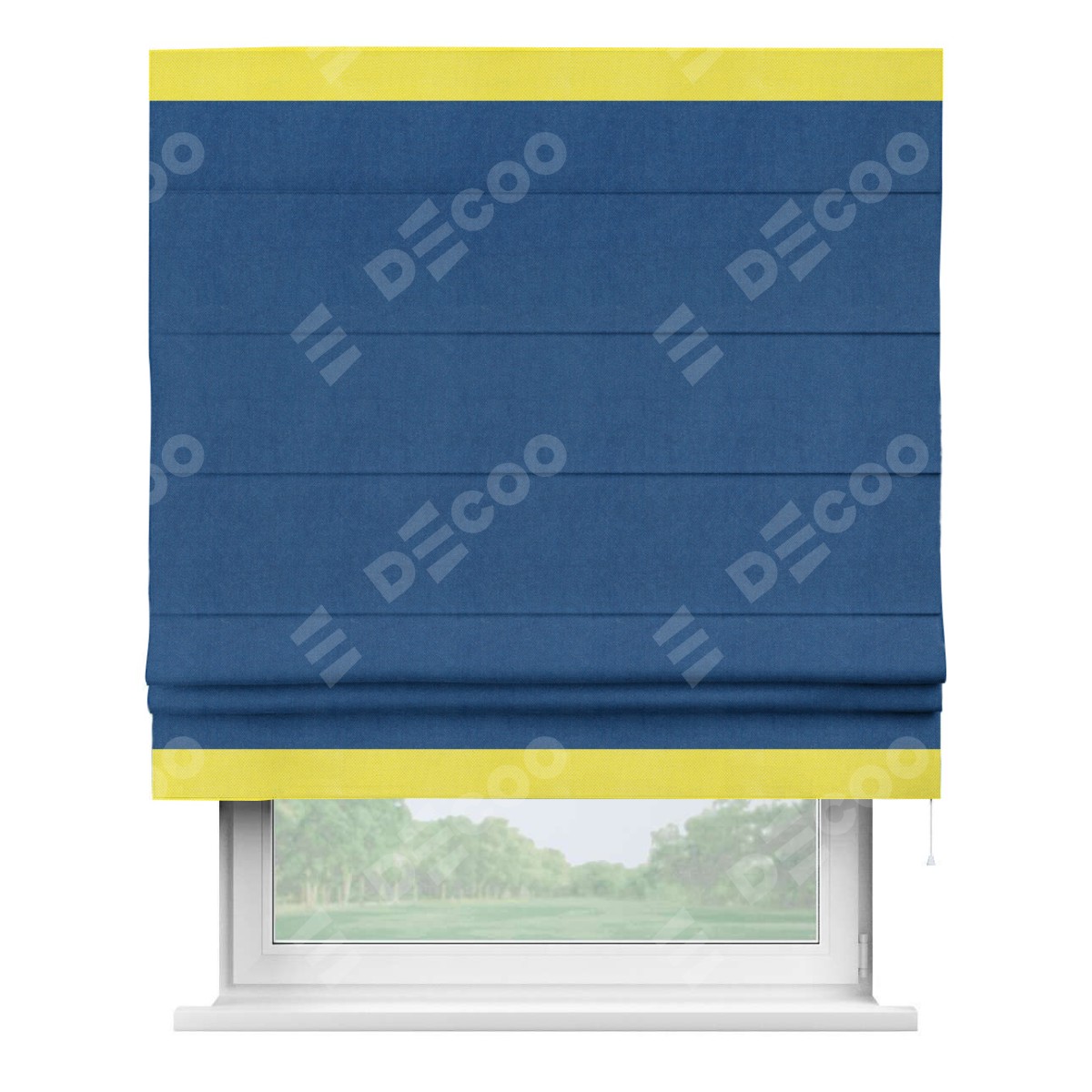 Римская штора производителя «Cortin», используется для проёма, пошита из ткани вельвет синий, артикул ткани 85554. Отделка шторы кантом «Горизонт», ткань для канта используется из вельвета разной расцветки на выбор. Имеет универсальный механизм и подходит для монтажа: на потолок, на стену и в нишу.