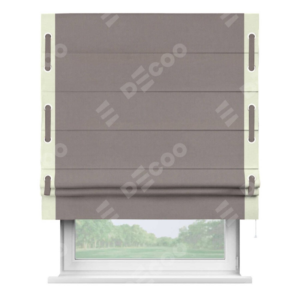 Римская штора производителя «Cortin», используется для проёма, пошита из ткани вельвет темно-бежевый, артикул ткани 82527. Отделка шторы кантом «Стрим Дуо» на кантах расположены люверсы с пояском, ткань для канта используется из вельвета разной расцветки на выбор. Ткань для пояска обычно используется из основной ткани шторы, а так же можно сделать из любой расцветки по желанию. Имеет универсальный механизм и подходит для монтажа: на потолок, на стену и в нишу.