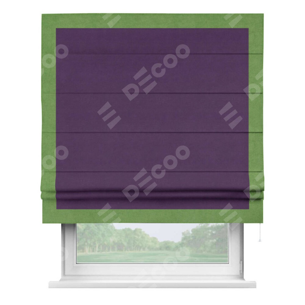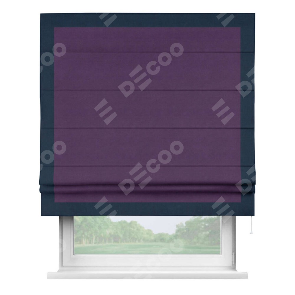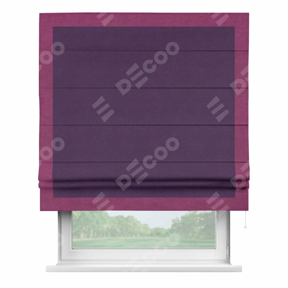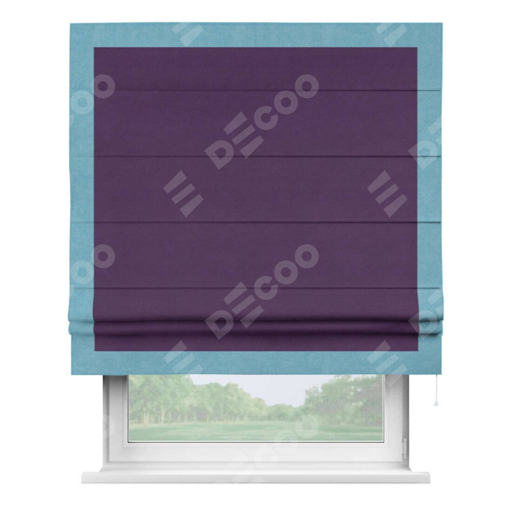 Римская штора производителя «Cortin», используется для проёма, пошита из ткани вельвет темно-фиолетовый, артикул ткани 17753. Отделка шторы кантом «Чесс», ткань для канта используется из вельвета разной расцветки на выбор. Имеет универсальный механизм и подходит для монтажа: на потолок, на стену и в нишу.