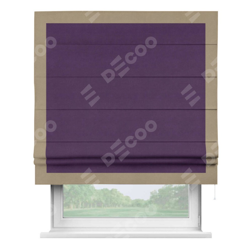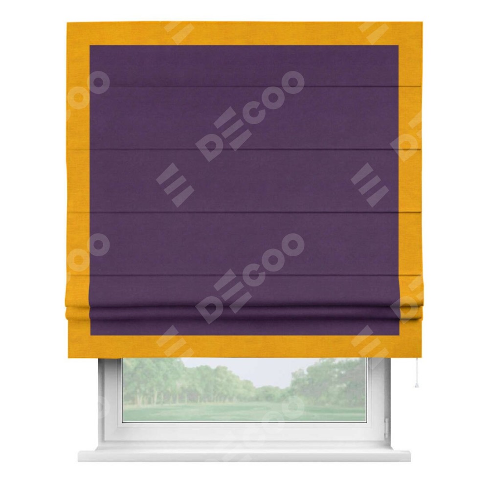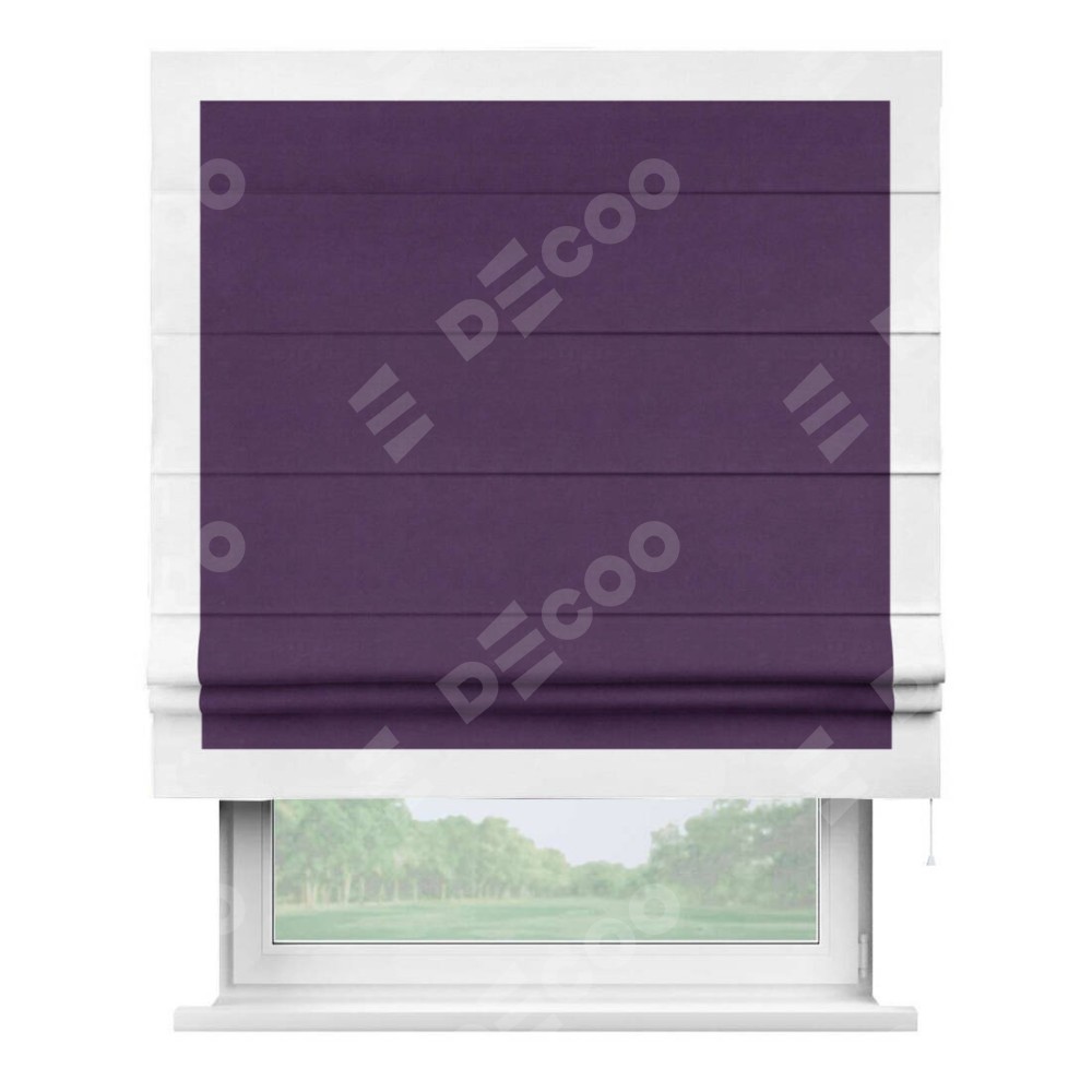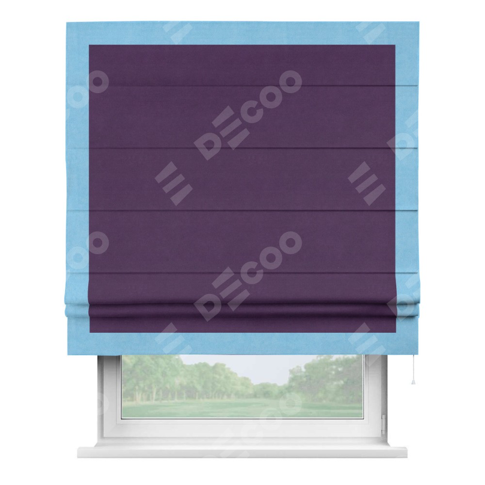 Римская штора производителя «Cortin», используется для проёма, пошита из ткани вельвет темно-фиолетовый, артикул ткани 17753. Отделка шторы кантом «Чесс», ткань для канта используется из вельвета разной расцветки на выбор. Имеет универсальный механизм и подходит для монтажа: на потолок, на стену и в нишу.