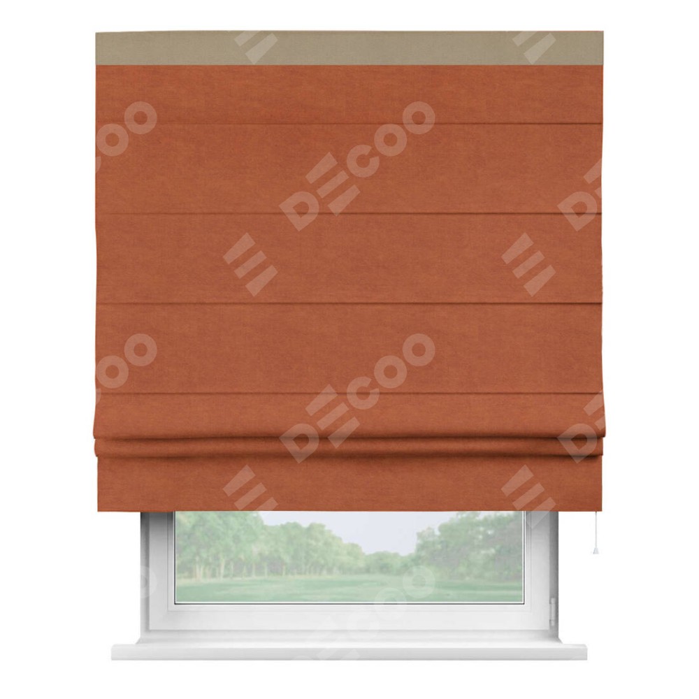 Римская штора производителя «Cortin», используется для проёма, пошита из ткани вельвет терракотовый, артикул ткани 85548. Отделка шторы кантом «Кинг», ткань для канта используется из вельвета разной расцветки на выбор. Имеет универсальный механизм и подходит для монтажа: на потолок, на стену и в нишу.