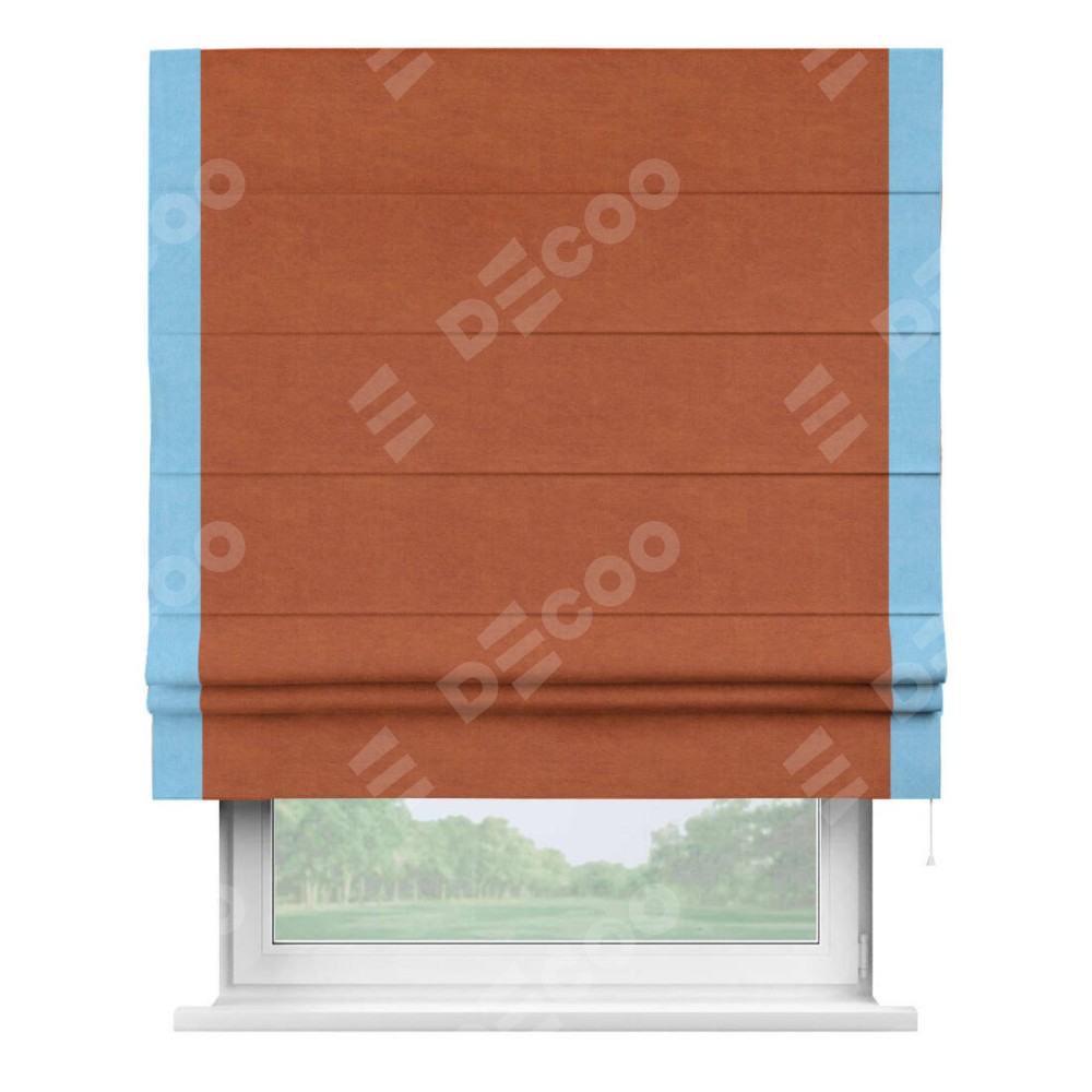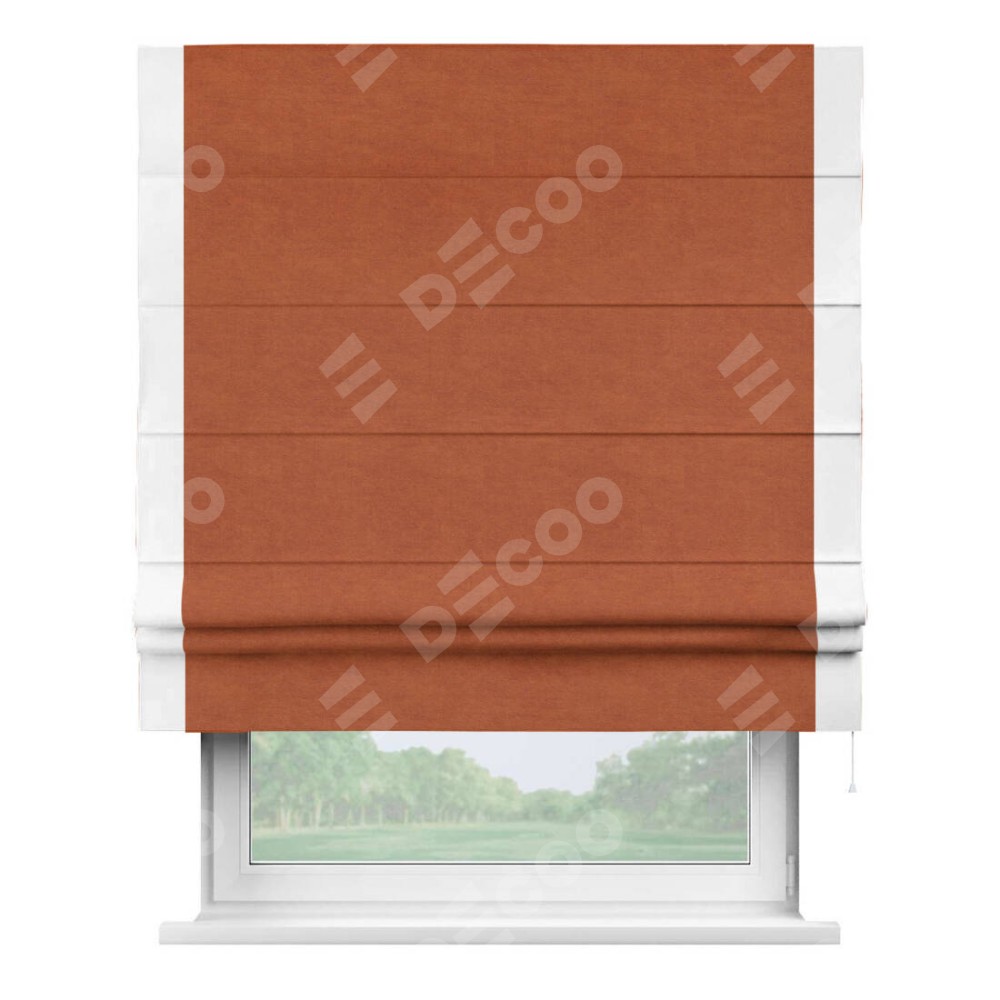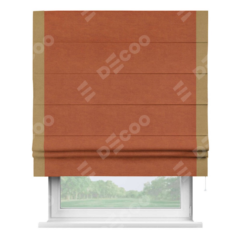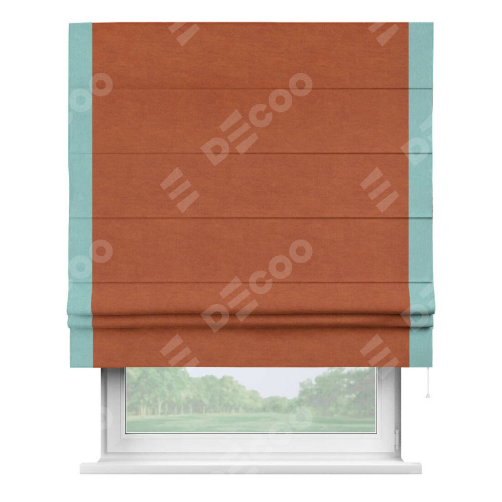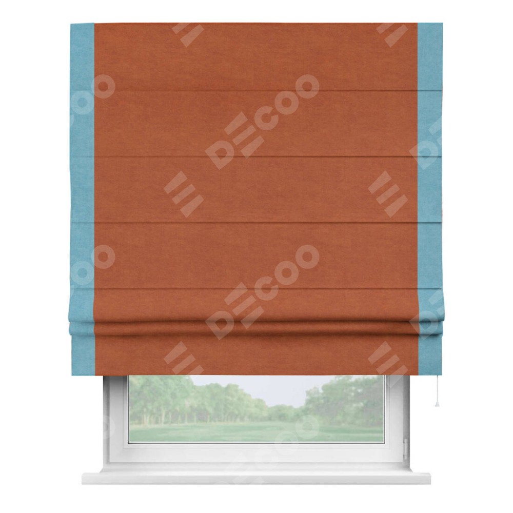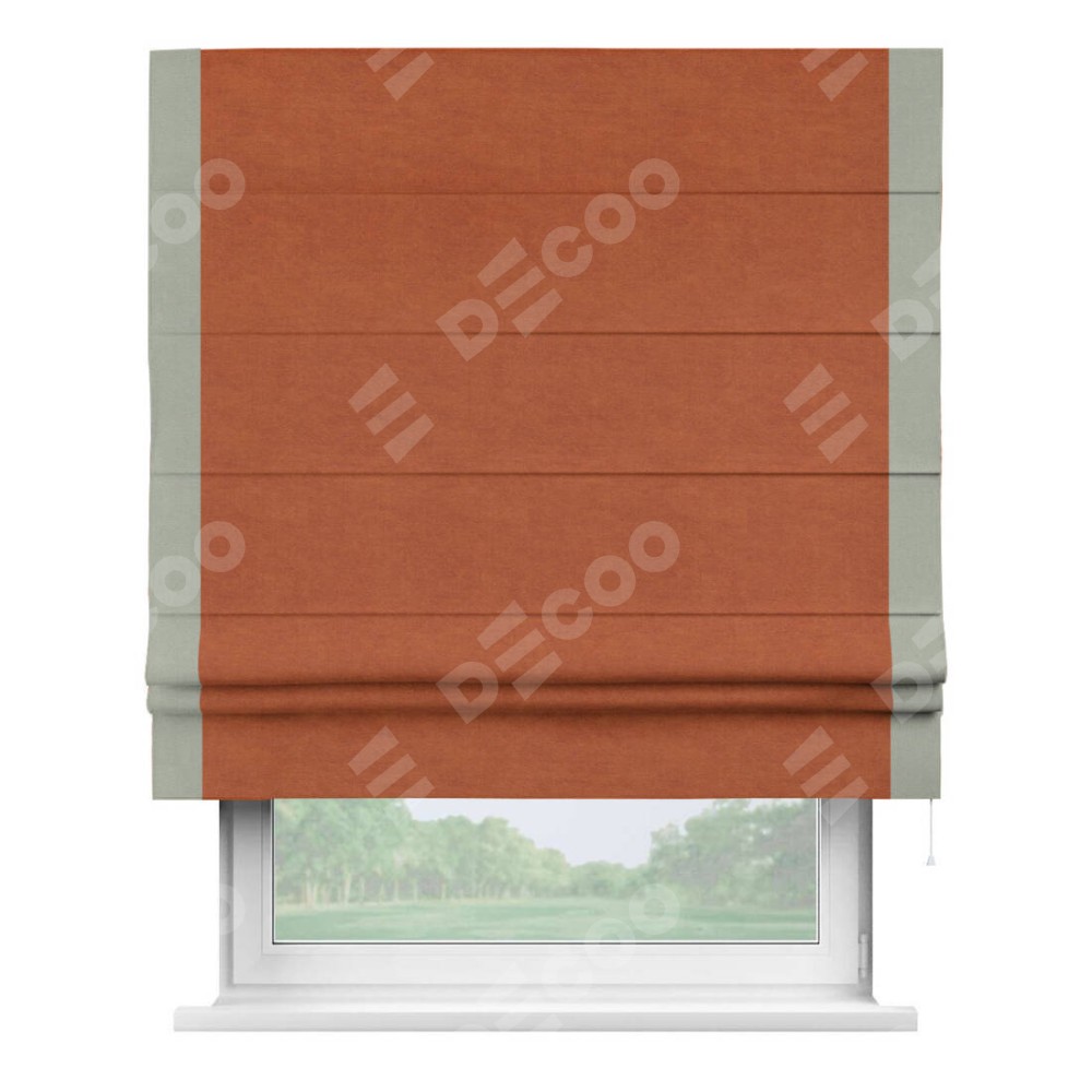 Римская штора производителя «Cortin», используется для проёма, пошита из ткани вельвет терракотовый, артикул ткани 85548. Отделка шторы кантом «Стрим Дуо», ткань для канта используется из вельвета разной расцветки на выбор. Имеет универсальный механизм и подходит для монтажа: на потолок, на стену и в нишу.