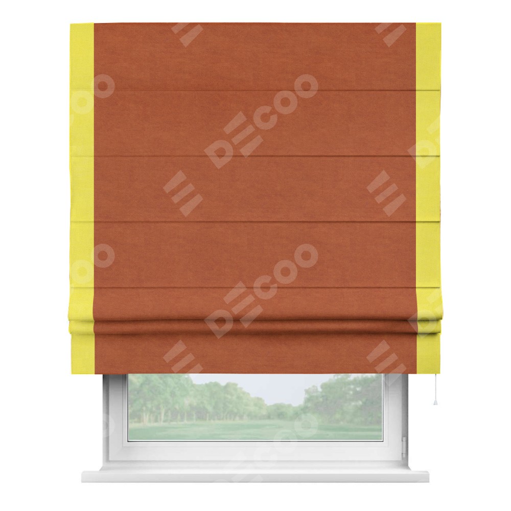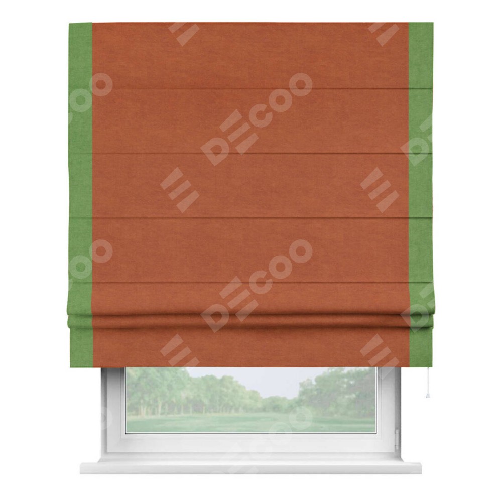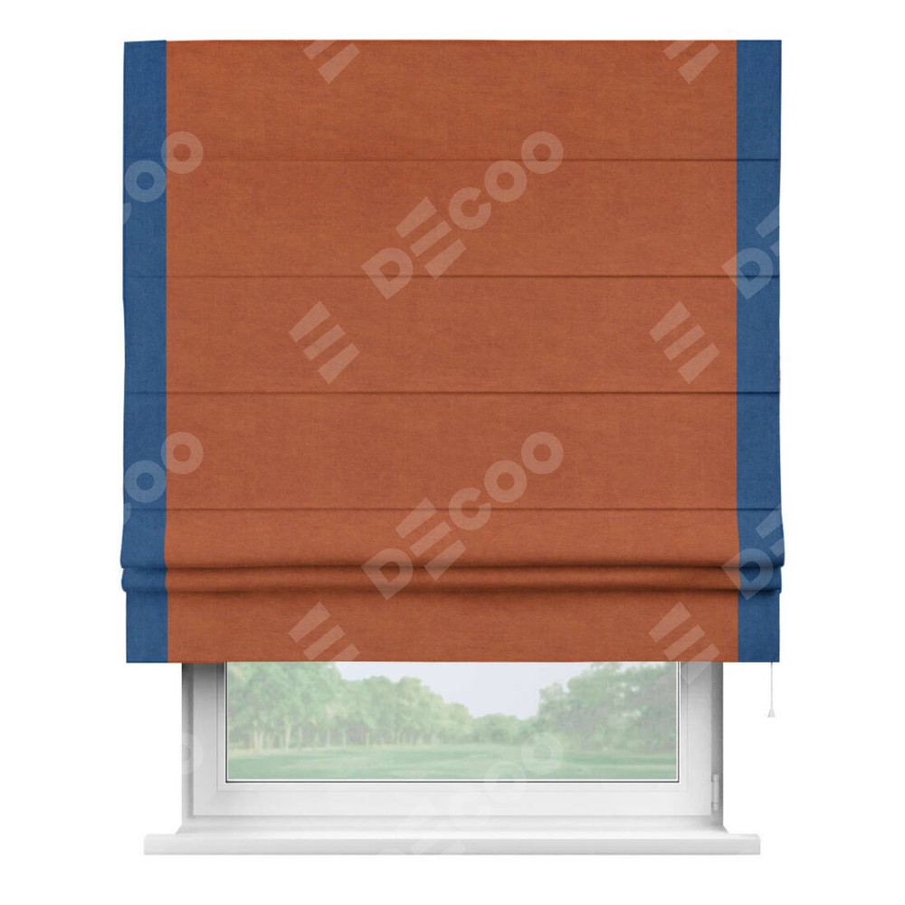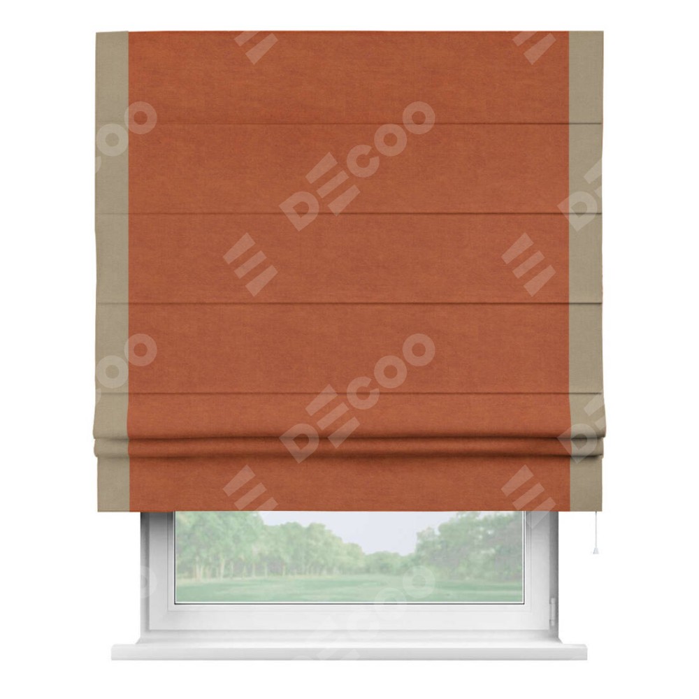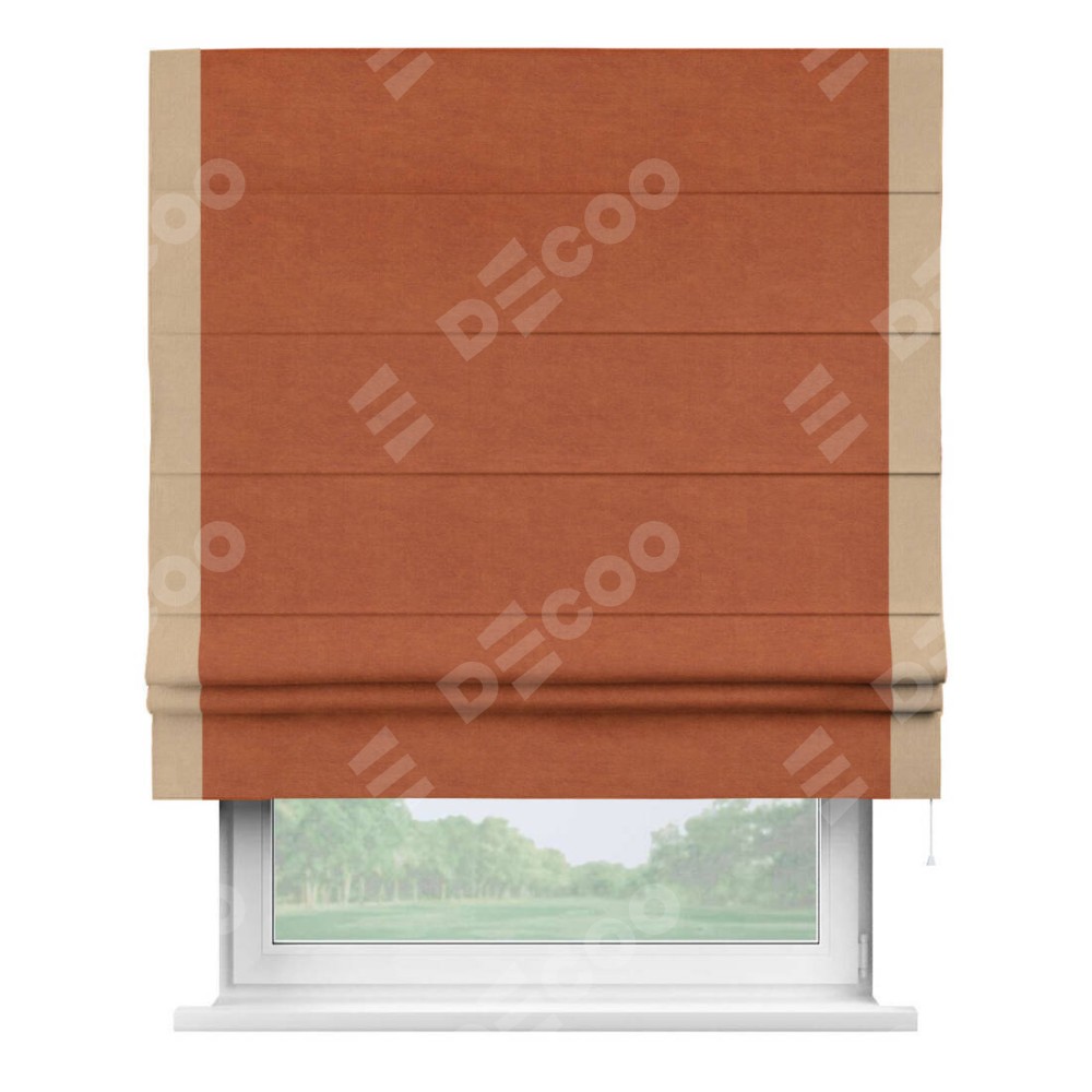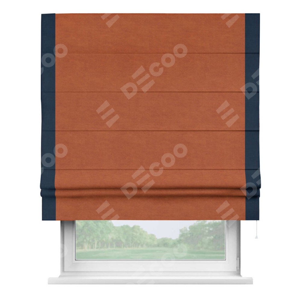 Римская штора производителя «Cortin», используется для проёма, пошита из ткани вельвет терракотовый, артикул ткани 85548. Отделка шторы кантом «Стрим Дуо», ткань для канта используется из вельвета разной расцветки на выбор. Имеет универсальный механизм и подходит для монтажа: на потолок, на стену и в нишу.