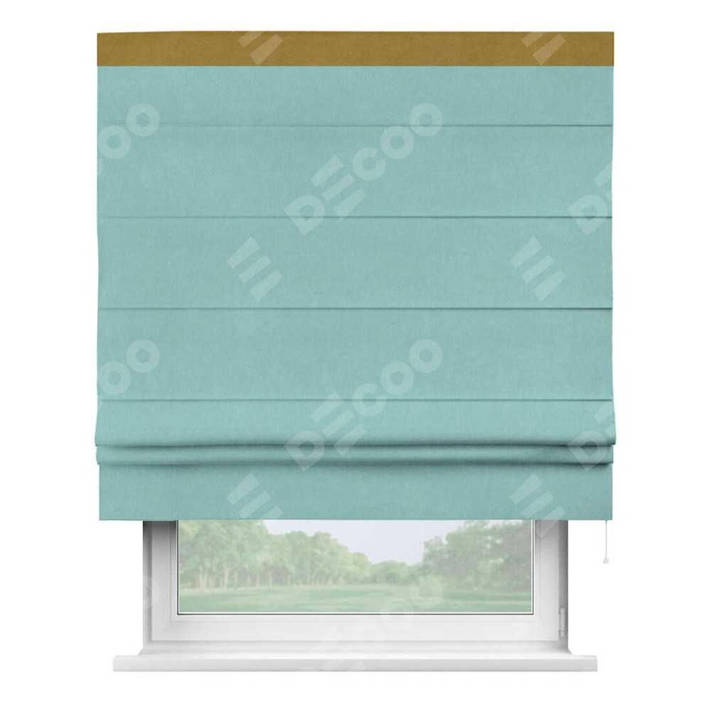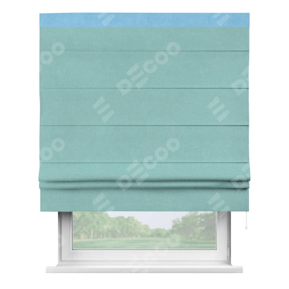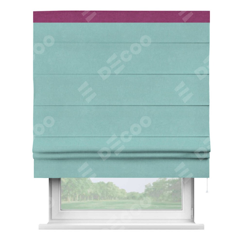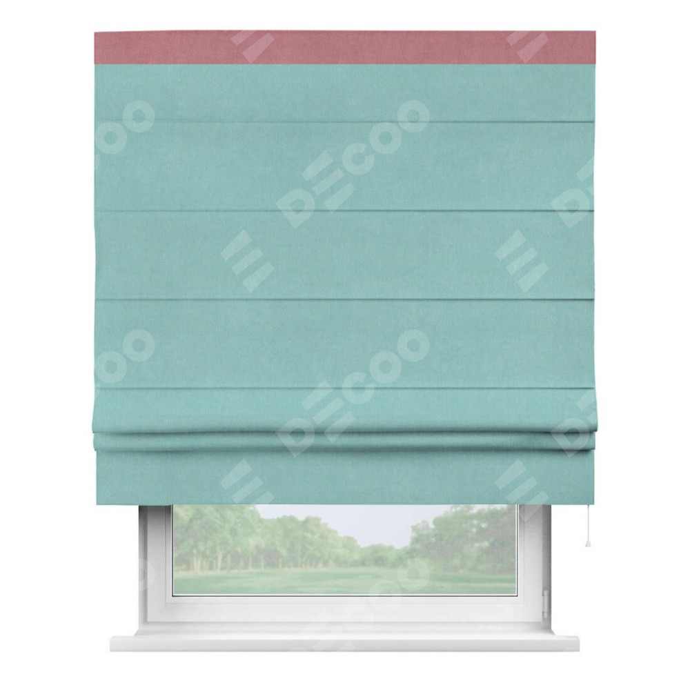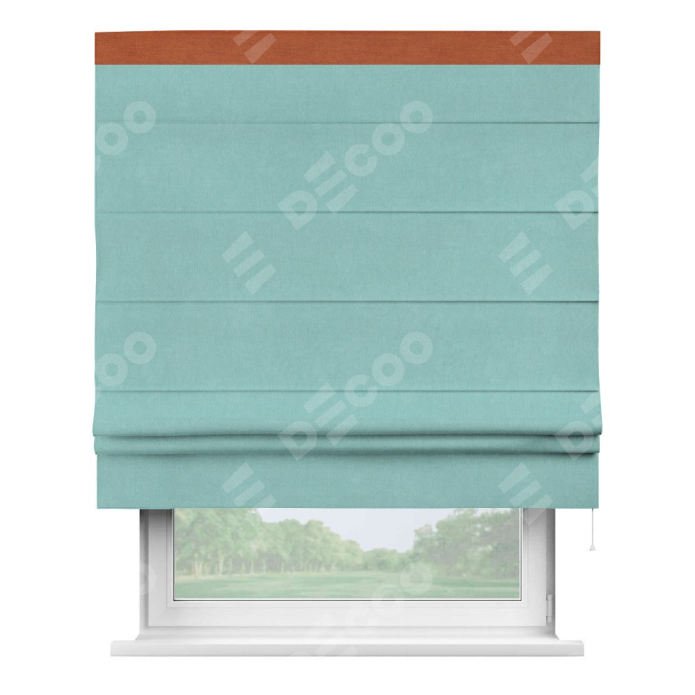 Римская штора производителя «Cortin», используется для проёма, пошита из ткани вельвет тиффани, артикул ткани 17765. Отделка шторы кантом «Кинг», ткань для канта используется из вельвета разной расцветки на выбор. Имеет универсальный механизм и подходит для монтажа: на потолок, на стену и в нишу.