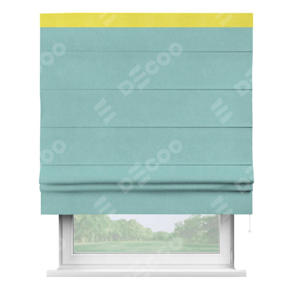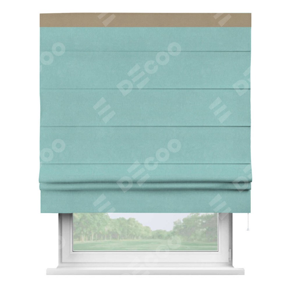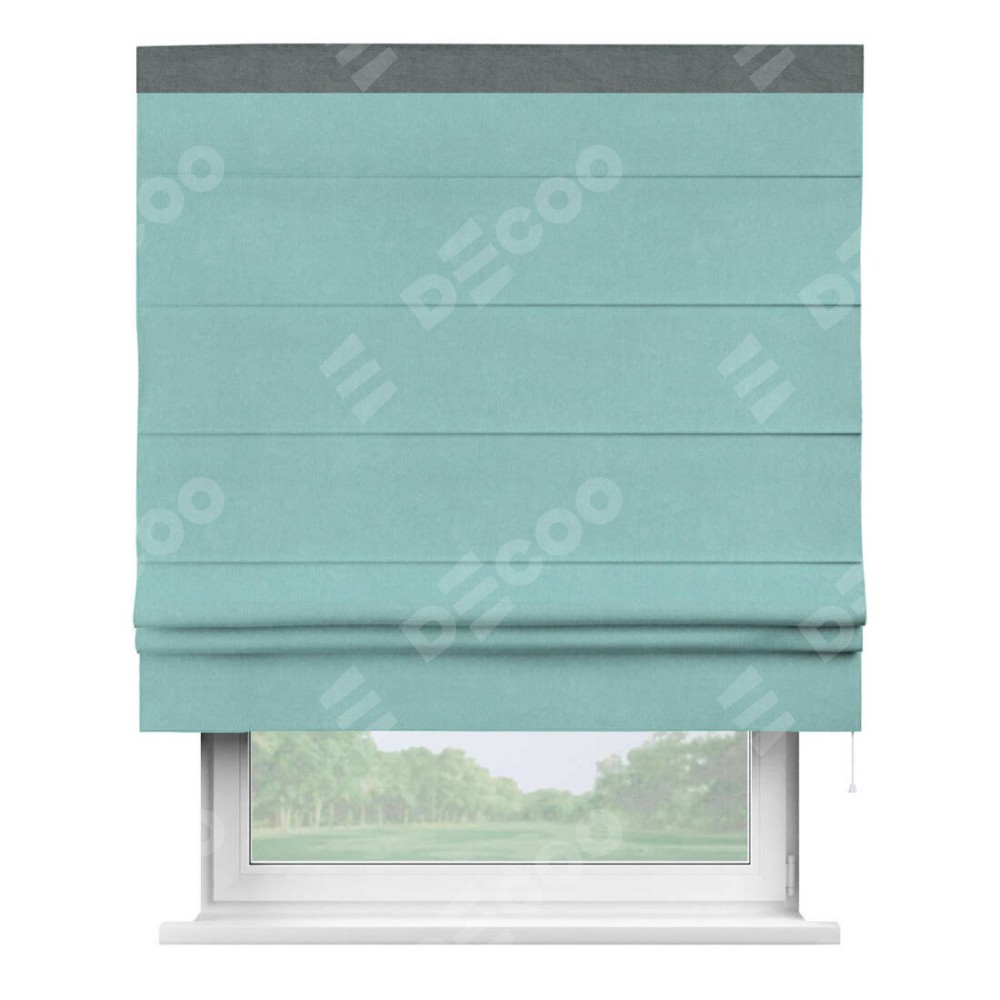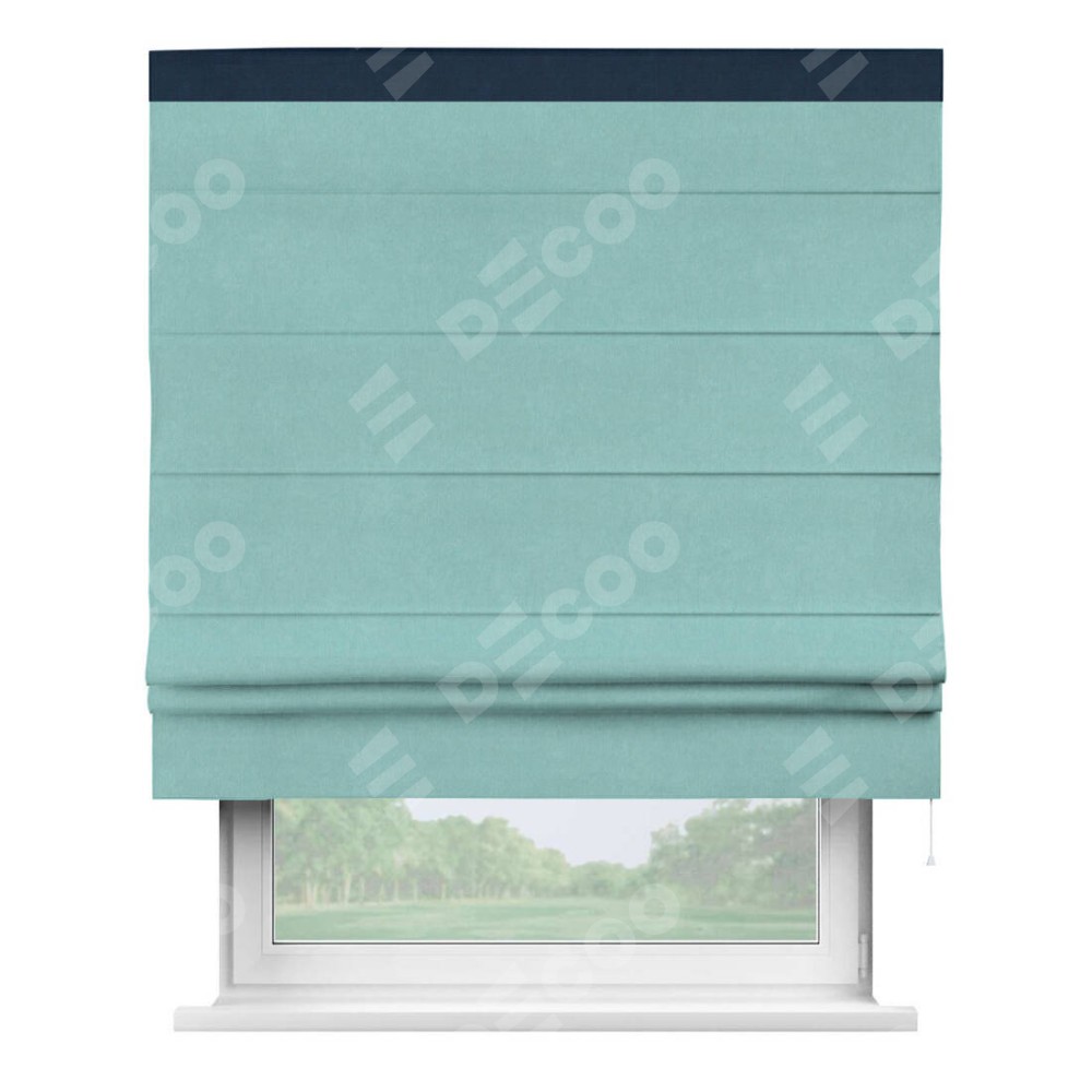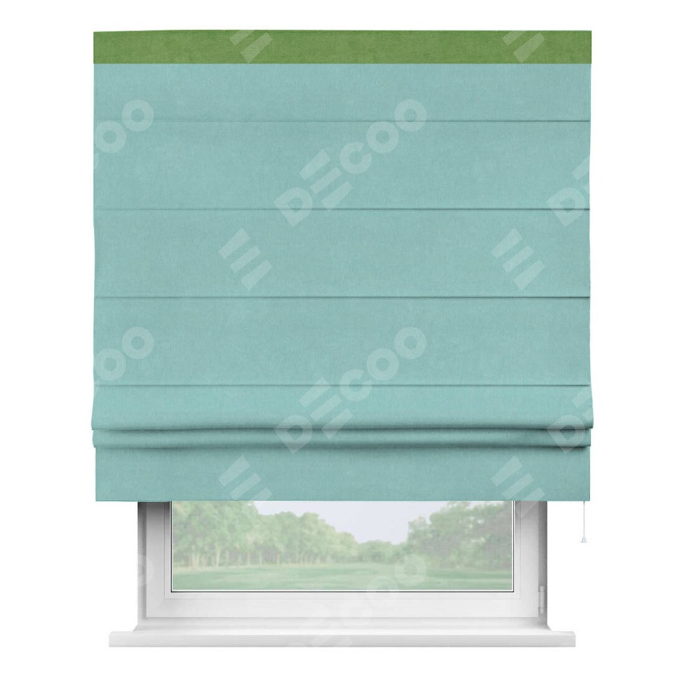 Римская штора производителя «Cortin», используется для проёма, пошита из ткани вельвет тиффани, артикул ткани 17765. Отделка шторы кантом «Кинг», ткань для канта используется из вельвета разной расцветки на выбор. Имеет универсальный механизм и подходит для монтажа: на потолок, на стену и в нишу.
