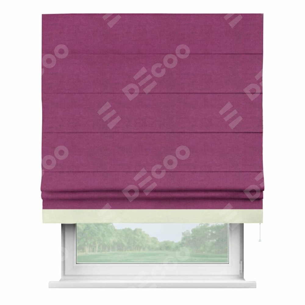 Римская штора производителя «Cortin», используется для проёма, пошита из ткани вельвет фиолетовый, артикул ткани 85552. Отделка шторы кантом «Джестер», ткань для канта используется из вельвета разной расцветки на выбор. Имеет универсальный механизм и подходит для монтажа: на потолок, на стену и в нишу.