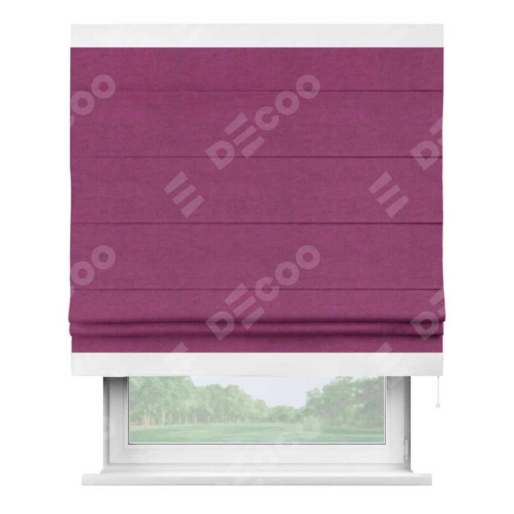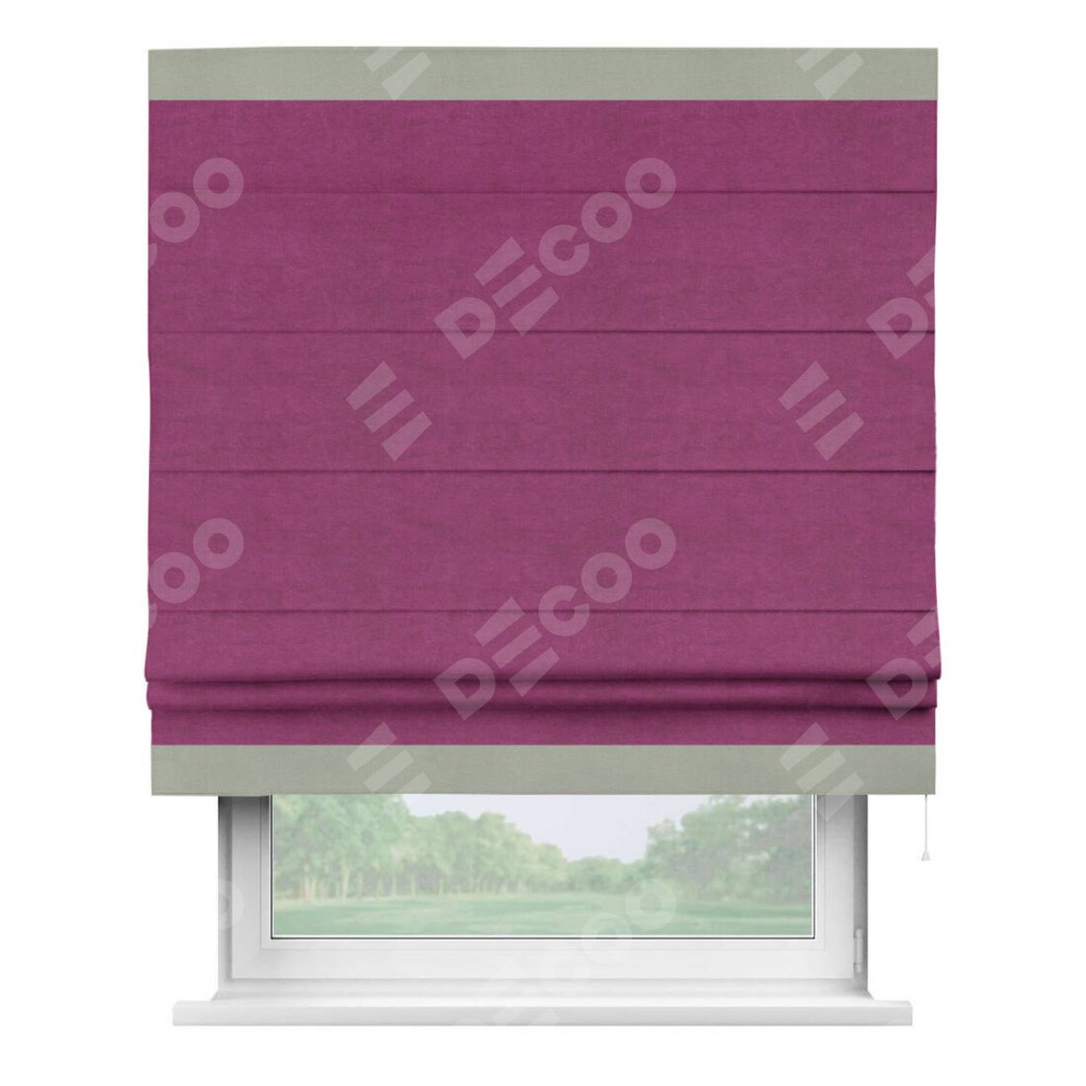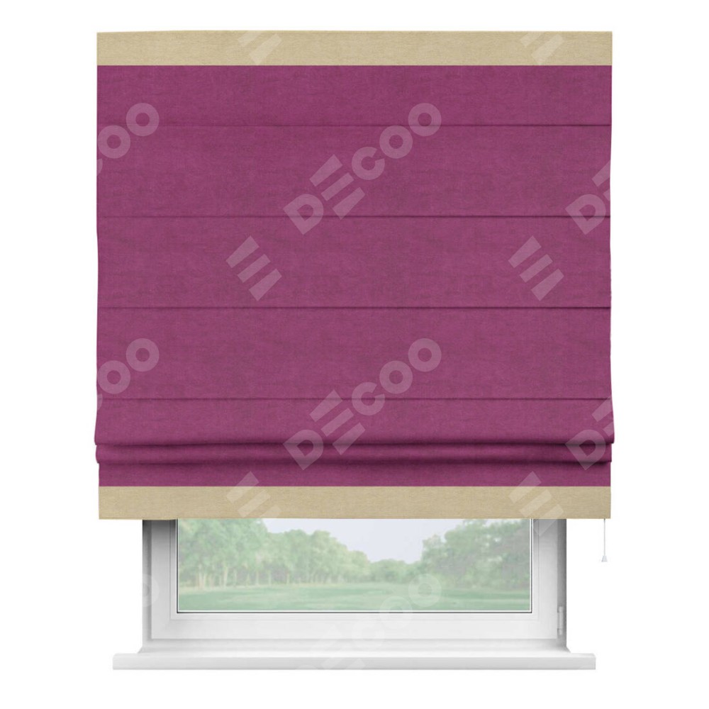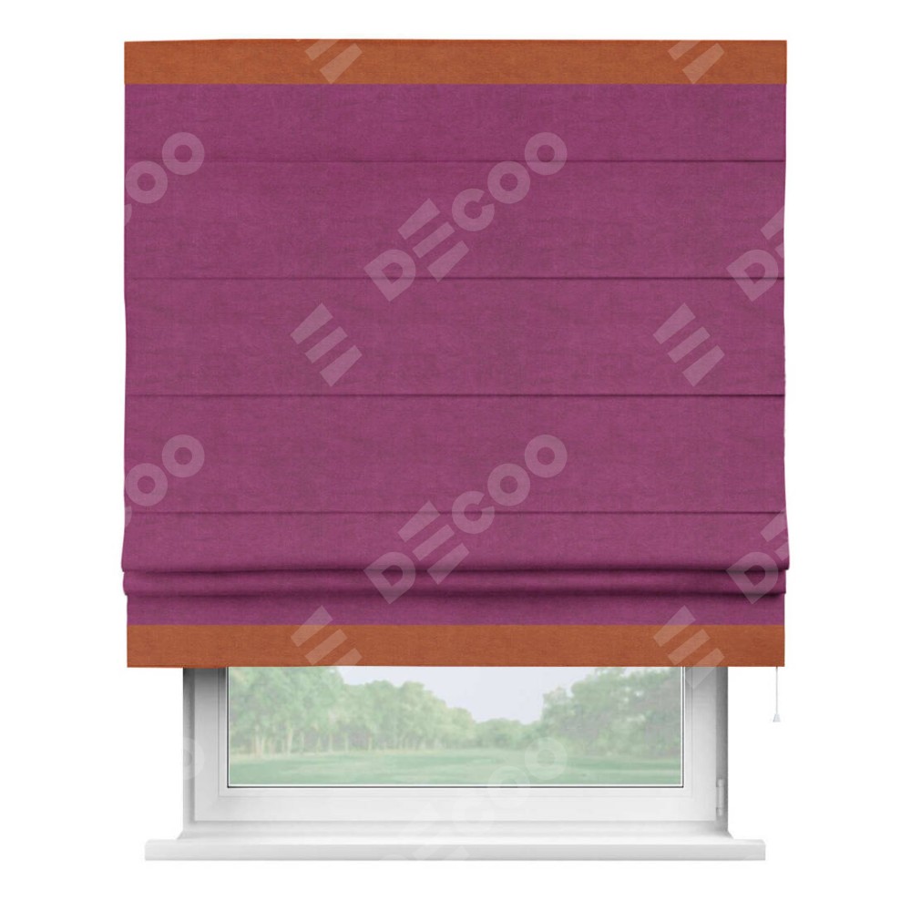 Римская штора производителя «Cortin», используется для проёма, пошита из ткани вельвет фиолетовый, артикул ткани 85552. Отделка шторы кантом «Горизонт», ткань для канта используется из вельвета разной расцветки на выбор. Имеет универсальный механизм и подходит для монтажа: на потолок, на стену и в нишу.