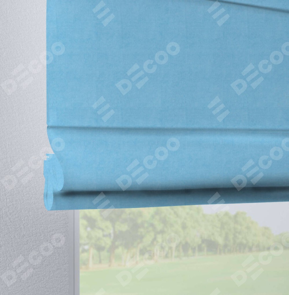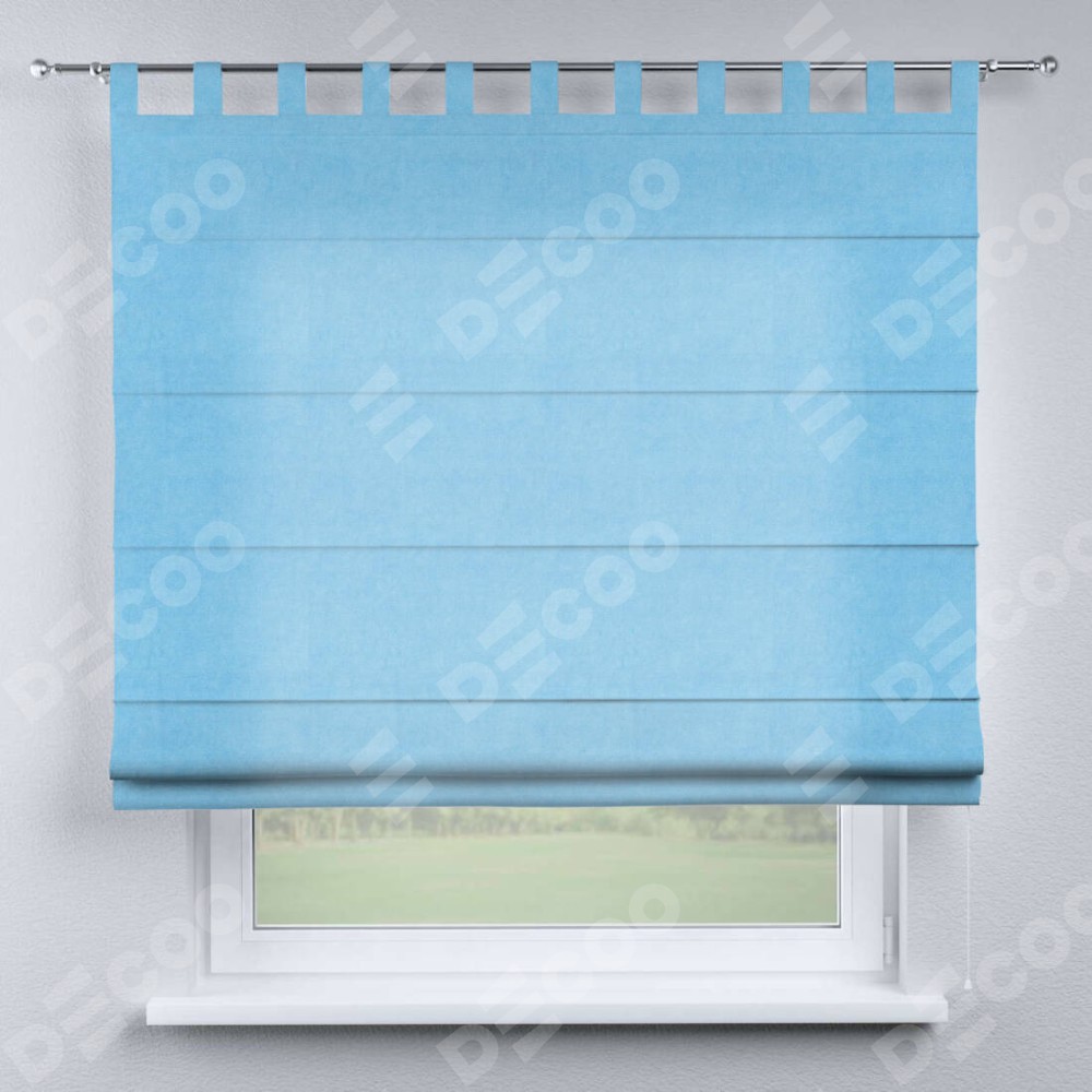 Римская штора производителя «Cortin», используется для проёма, пошита из ткани вельвет голубой, артикул ткани 85544. Данная модель пошита на петлях, комплектуется на выбор круглым карнизом и подходит для монтажа на стену. Римская штора на петлях имеет простую систему регулировки высоты, отличительным преимуществом данной модели является простой способ монтажа. Достаточно повесить ее на трубу и штора готова!