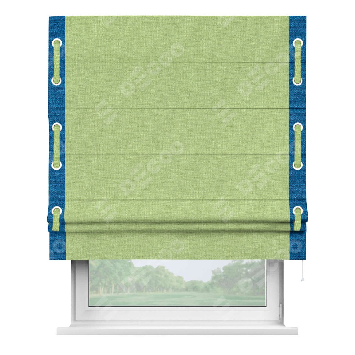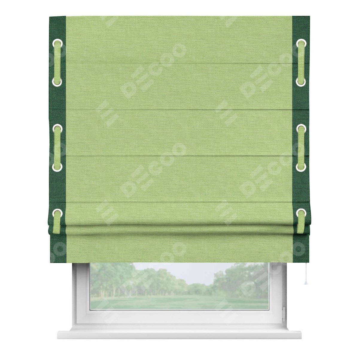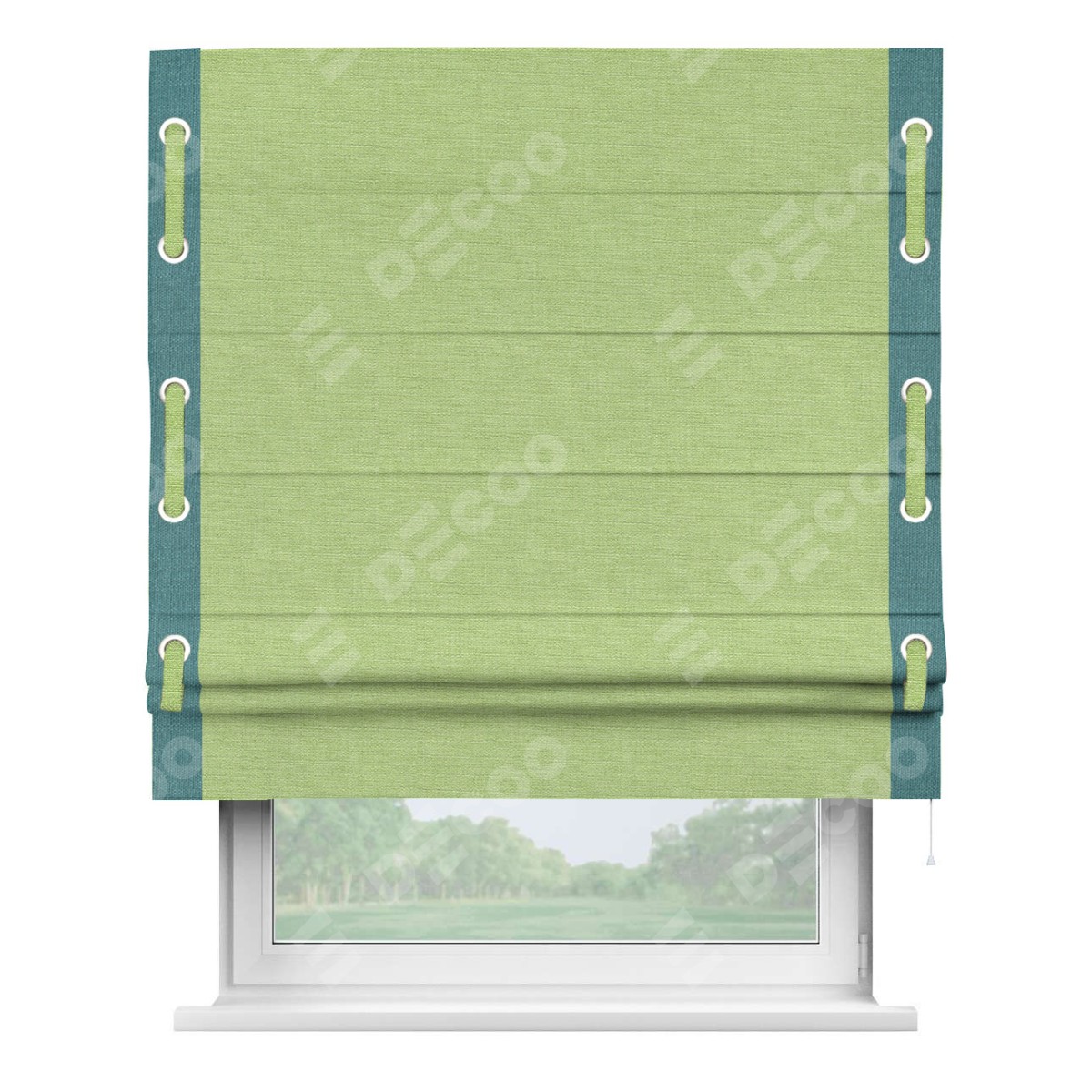 Римская штора производителя «Cortin», используется для проёма, пошита из ткани лён зеленый, артикул 85906. Отделка шторы кантом «Стрим Дуо» на кантах расположены люверсы с пояском, ткань для канта используется из льна разной расцветки на выбор. Ткань для пояска обычно используется из основной ткани шторы, а так же можно сделать из любой расцветки по желанию. Имеет универсальный механизм и подходит для монтажа: на потолок, на стену и в нишу.