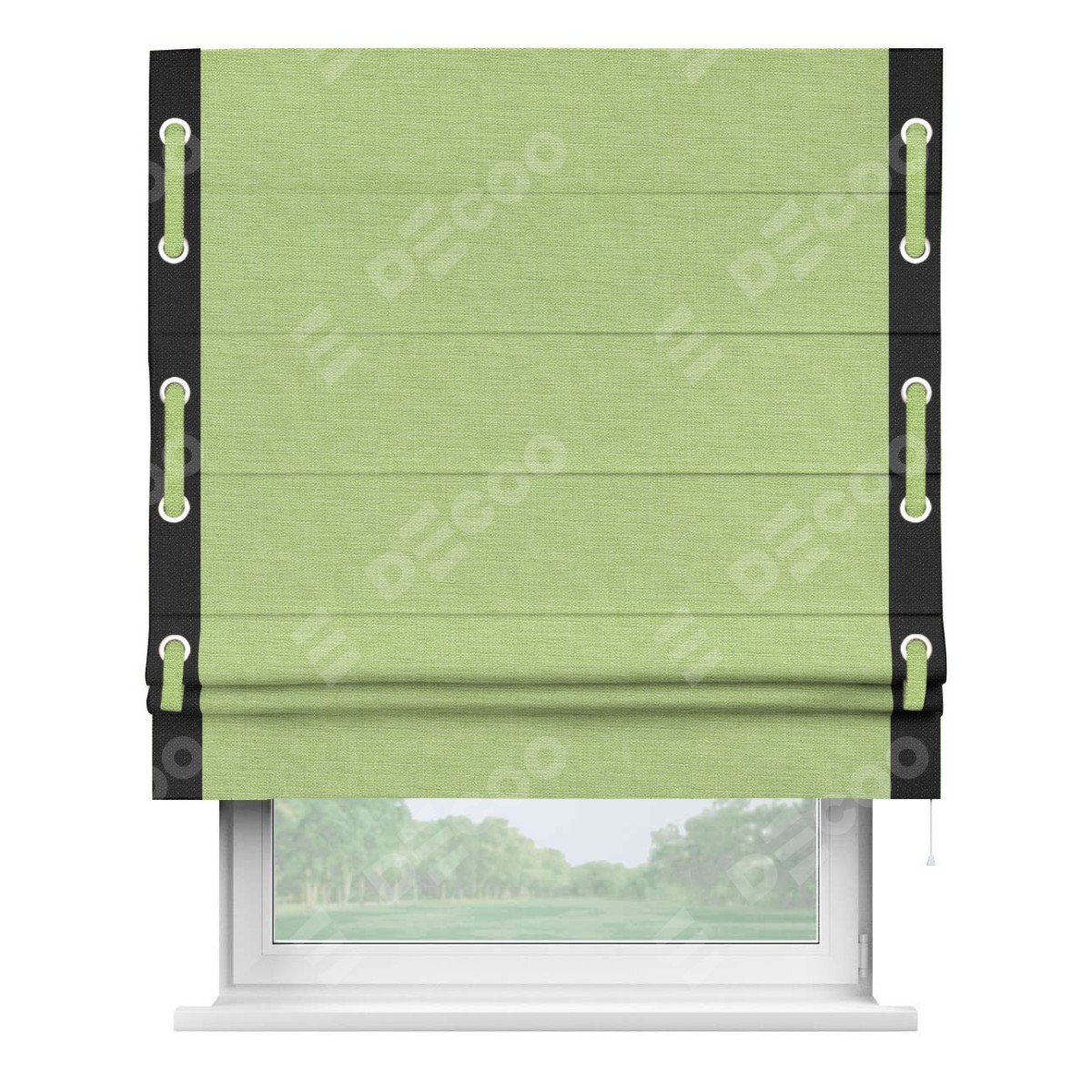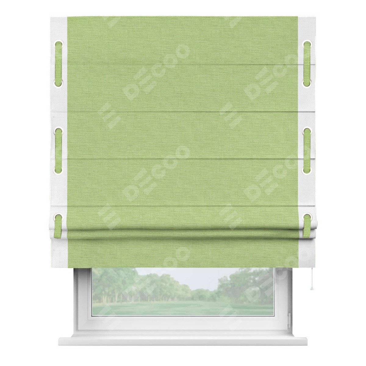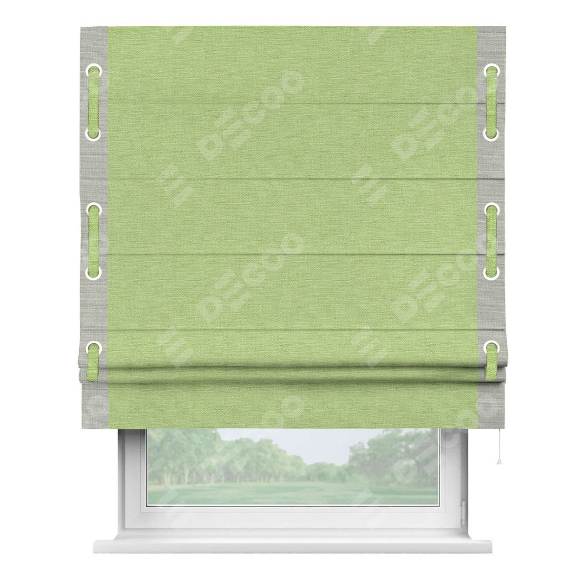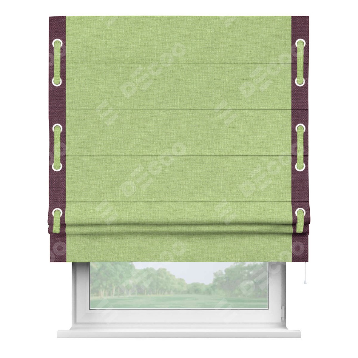 Римская штора производителя «Cortin», используется для проёма, пошита из ткани лён зеленый, артикул 85906. Отделка шторы кантом «Стрим Дуо» на кантах расположены люверсы с пояском, ткань для канта используется из льна разной расцветки на выбор. Ткань для пояска обычно используется из основной ткани шторы, а так же можно сделать из любой расцветки по желанию. Имеет универсальный механизм и подходит для монтажа: на потолок, на стену и в нишу.