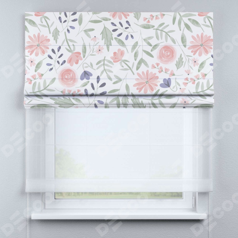 Римская штора день-ночь производителя «Cortin», используется для проёма, пошита из двух полотен, с лицевой блэкаут с нанесением сублимационной печати «Изысканные цветы», вторая ткань тюль (по стандарту комплектуется тюль белого цвета артикул V-01). Имеет универсальный механизм и подходит для монтажа: на потолок, на стену и в нишу.