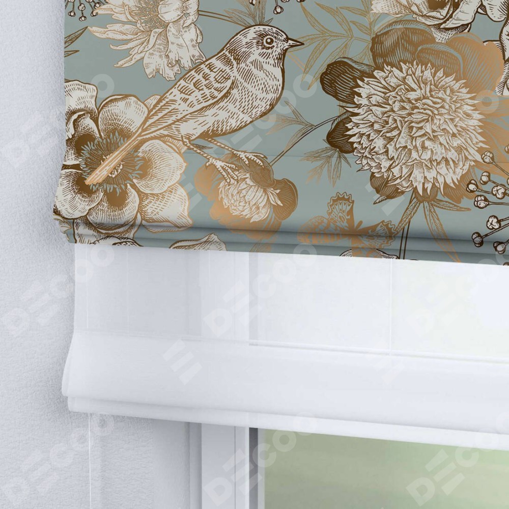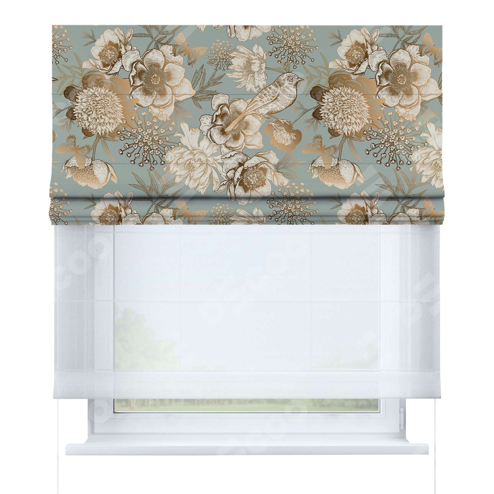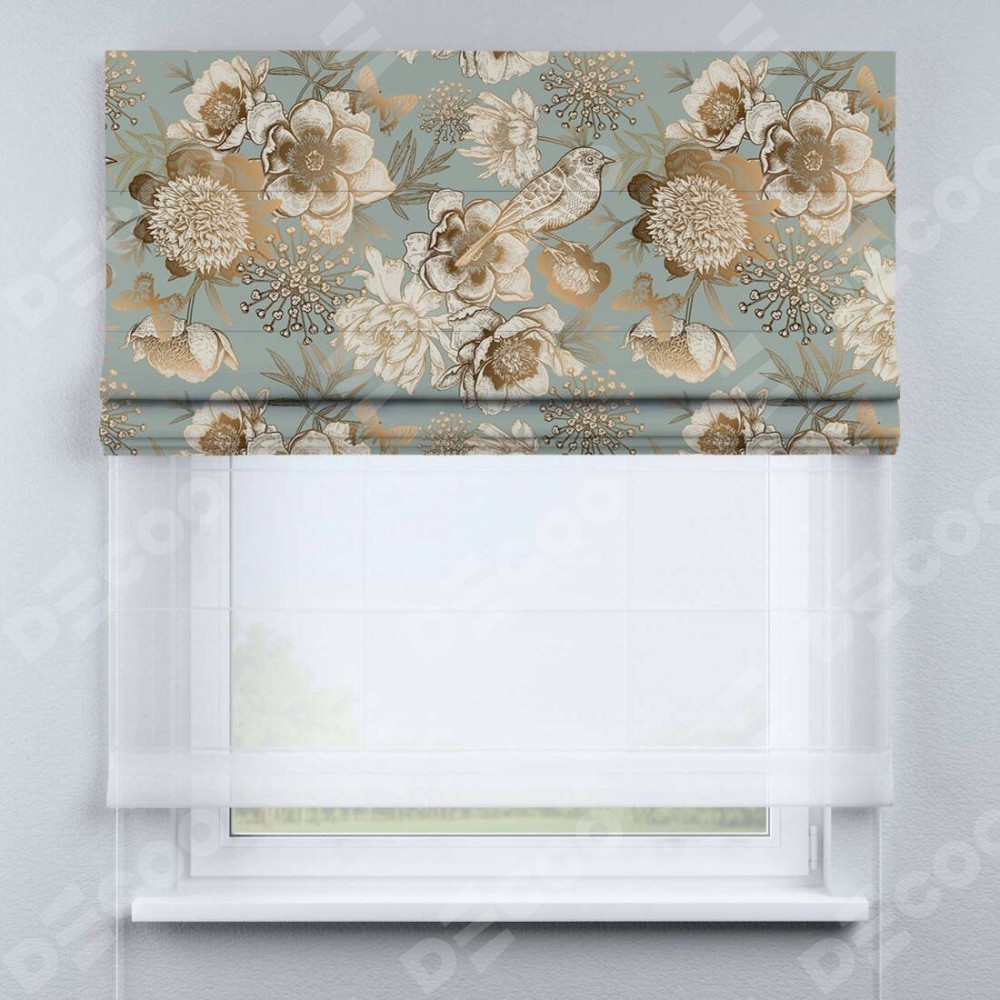 Римская штора день-ночь производителя «Cortin», используется для проёма, пошита из двух полотен, с лицевой блэкаут с нанесением сублимационной печати «Садовые цветы», вторая ткань тюль (по стандарту комплектуется тюль белого цвета артикул V-01). Имеет универсальный механизм и подходит для монтажа: на потолок, на стену и в нишу.