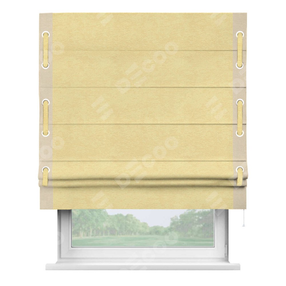 Римская штора производителя «Cortin», используется для проёма, пошита из ткани софт однотонный золотой, артикул 42934. Отделка шторы кантом «Стрим Дуо» на кантах расположены люверсы с пояском, ткань для канта используется из софта разной расцветки на выбор. Ткань для пояска обычно используется из основной ткани шторы, а так же можно сделать из любой расцветки по желанию. Имеет универсальный механизм и подходит для монтажа: на потолок, на стену и в нишу.
