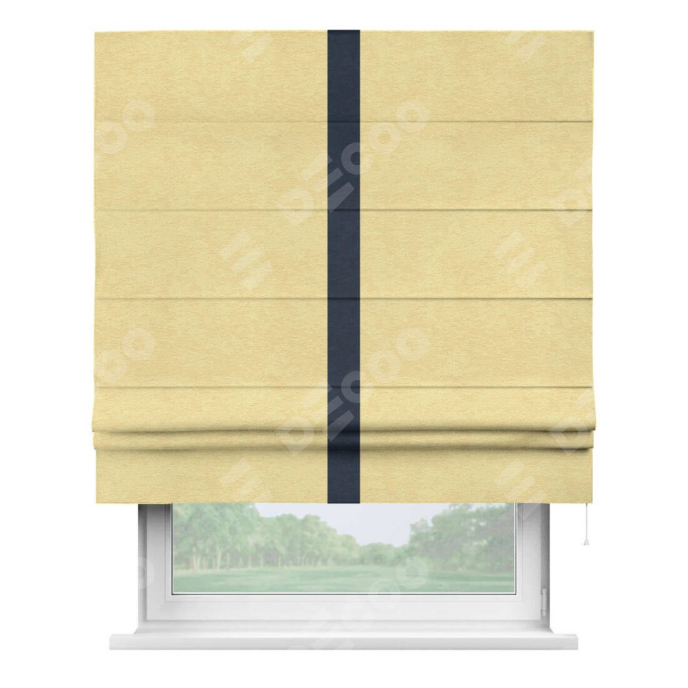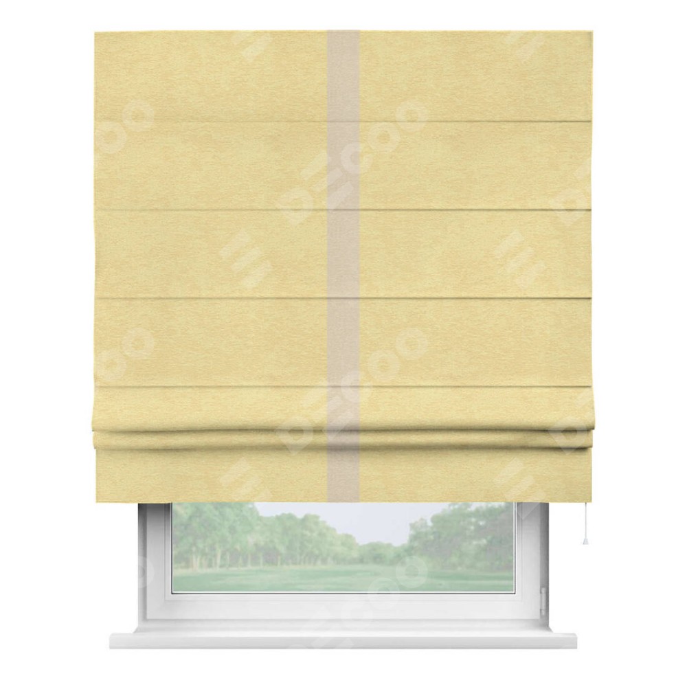 Римская штора производителя «Cortin», используется для проёма, пошита из ткани софт однотонный золотой, артикул 42934. Отделка шторы кантом «Хайвэй», ткань для канта используется из софта разной расцветки на выбор. Имеет универсальный механизм и подходит для монтажа: на потолок, на стену и в нишу.