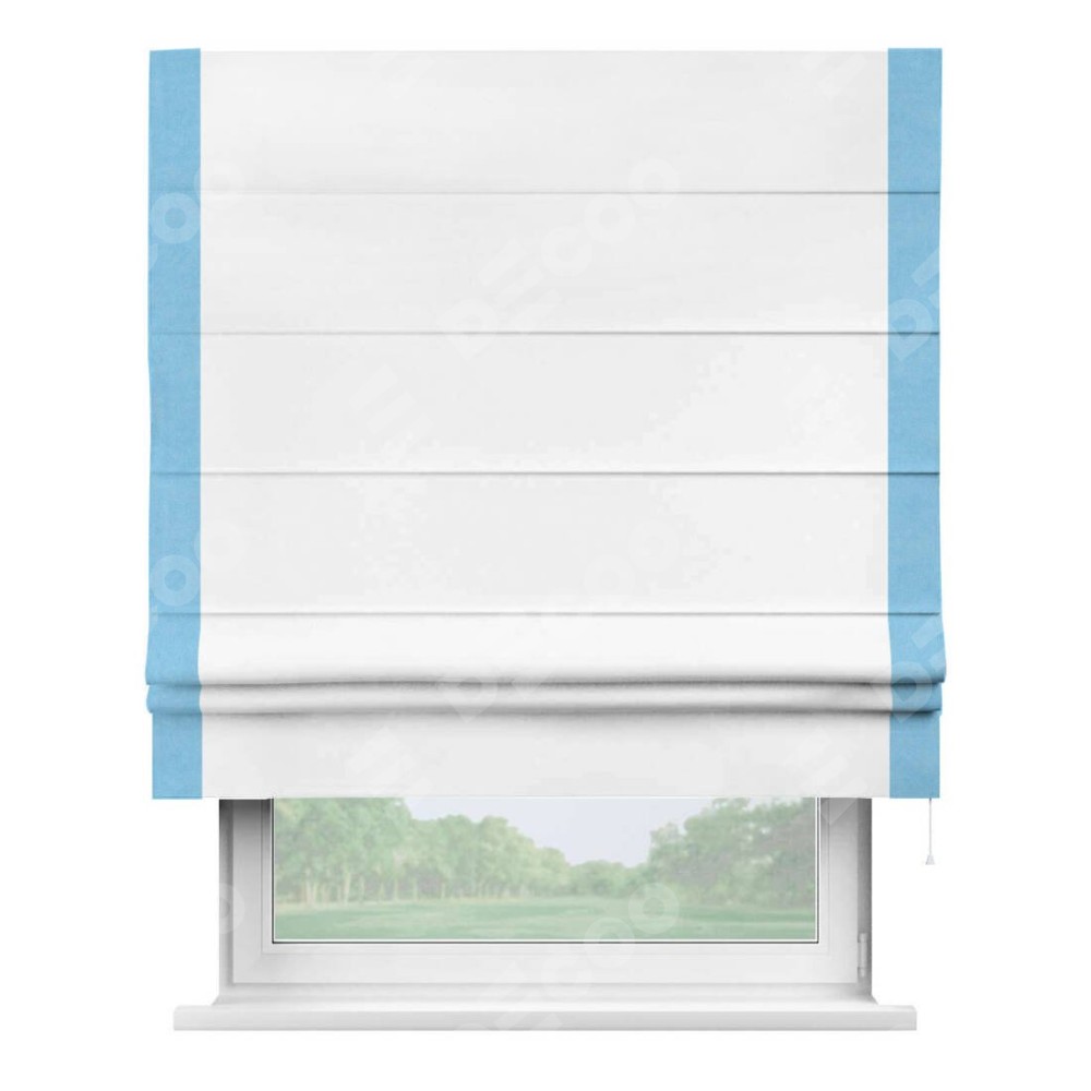 Римская штора производителя «Cortin», используется для проёма, пошита из ткани вельвет белоснежный, артикул ткани 19192. Отделка шторы кантом «Стрим Дуо», ткань для канта используется из вельвета разной расцветки на выбор. Имеет универсальный механизм и подходит для монтажа: на потолок, на стену и в нишу.