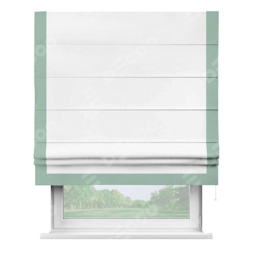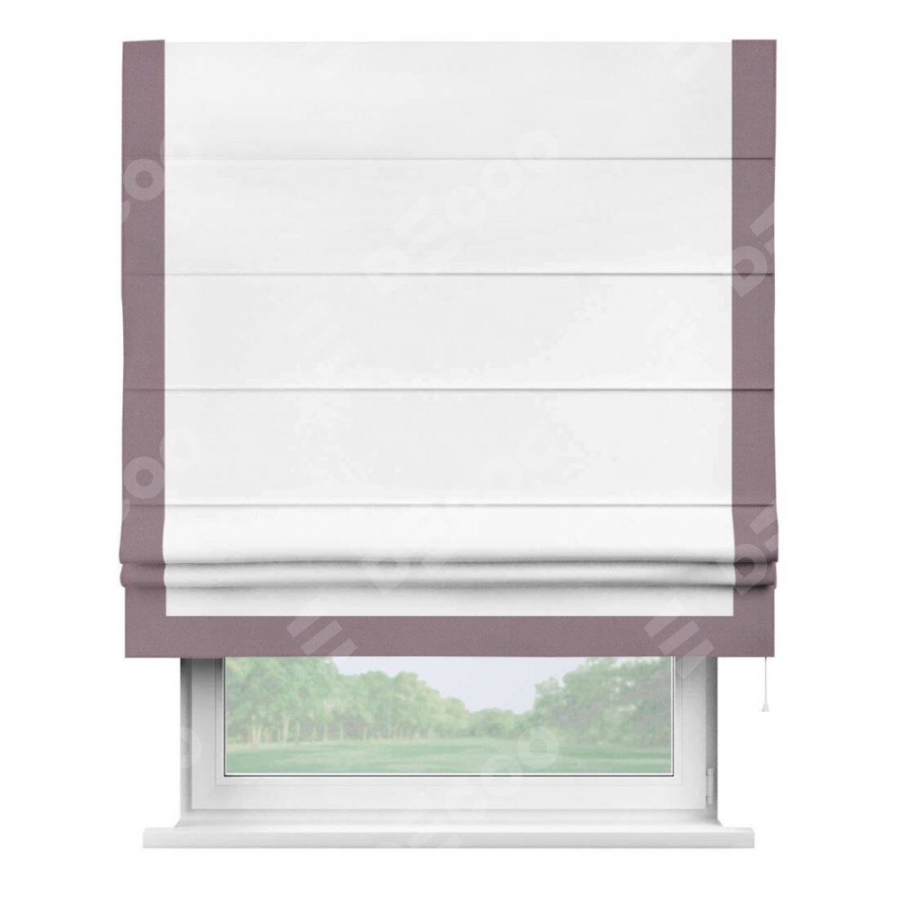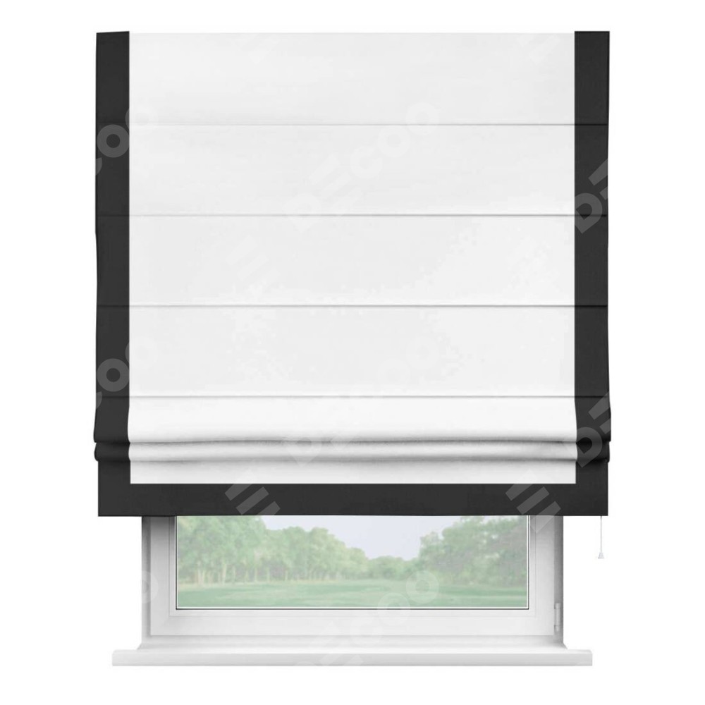 Римская штора производителя «Cortin», используется для проёма, пошита из ткани однотонная белоснежная, артикул ткани 41217. Отделка шторы кантом «Виктория», ткань для канта используется из блэкаута однотонного разной расцветки на выбор. Имеет универсальный механизм и подходит для монтажа: на потолок, на стену и в нишу.