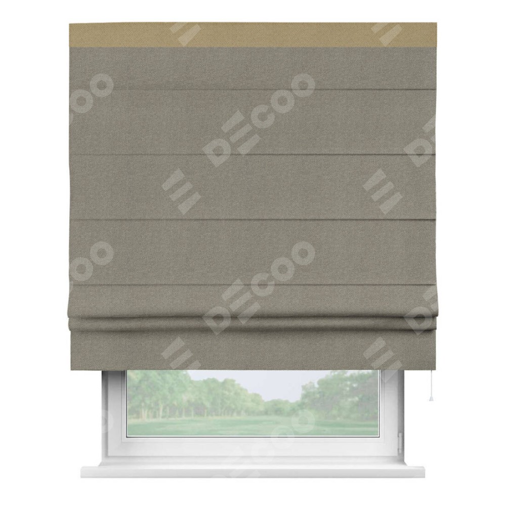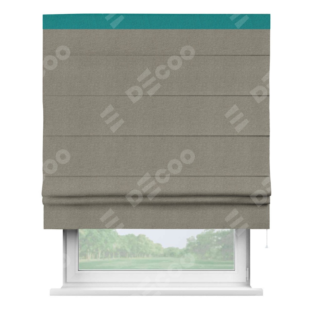 Римская штора производителя «Cortin», используется для проёма, пошита из ткани лён димаут cеро-зелёный, артикул 00003. Отделка шторы кантом «Кинг», ткань для канта используется из льна димаут разной расцветки на выбор. Имеет универсальный механизм и подходит для монтажа: на потолок, на стену и в нишу.