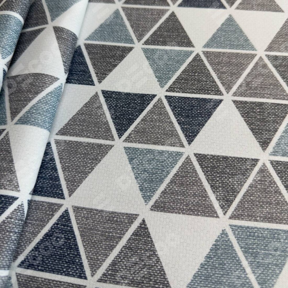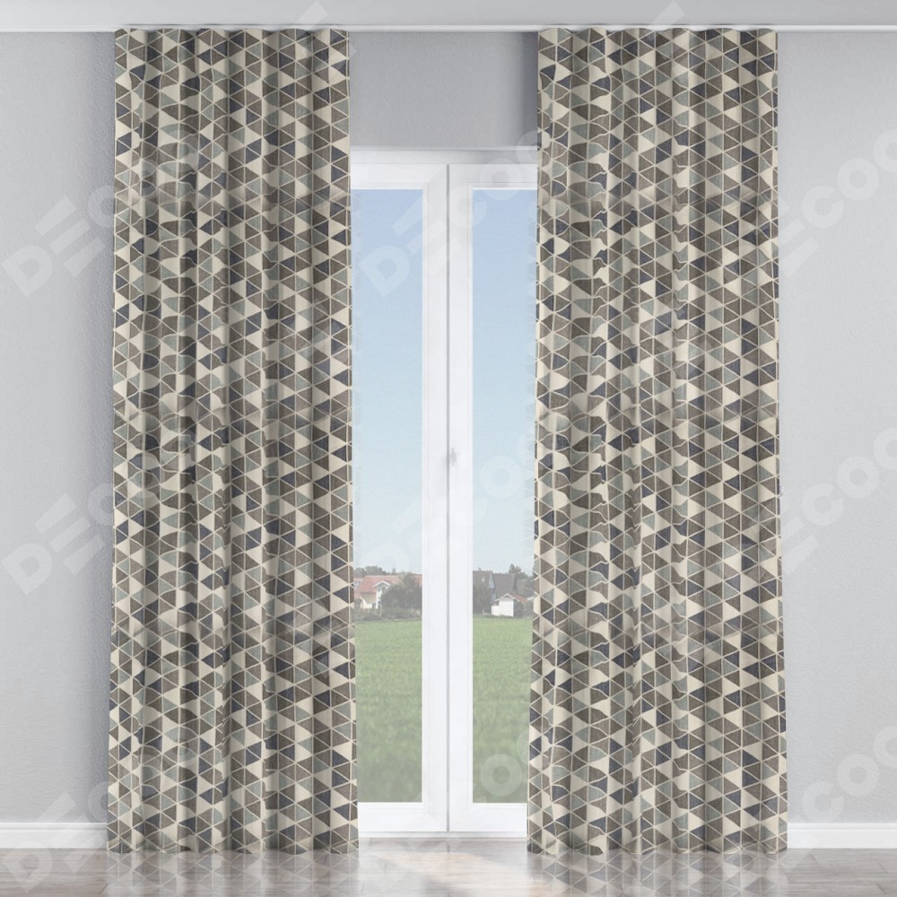 Комплект прямых штор, от производителя «Cortin», пошиты из ткани димаут «Треугольники синие», артикул ткани 23022. С изнаночной стороны в верхней части штор пристрачивается шторная лента с декоративными складками «Волна». Для создания элегантных складок прямые шторы шьются по стандарту с коэффициентом 1:2 (на 100 см. ширины проёма 200 см. ширины ткани).