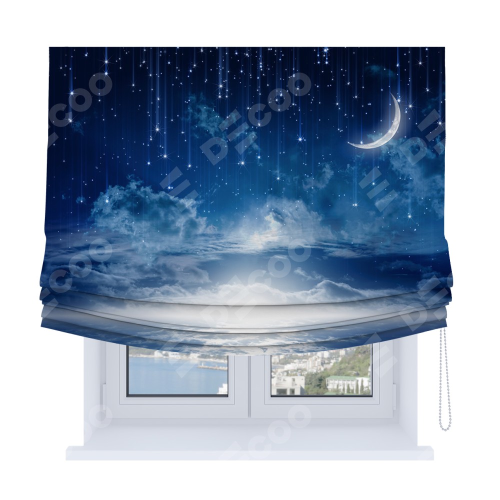 Римская штора Soft производителя «Cortin», используется для проёма, пошита из ткани блэкаут с нанесением сублимационной печати «Ночное небо». Имеет универсальный механизм и подходит для монтажа: на потолок, на стену и в нишу. В отличие от стандартных римских штор, римская штора Soft не имеет горизонтальных вставок и нижнего отвеса. Это позволяет ткани произвольно драпироваться в свободные мягкие складки.