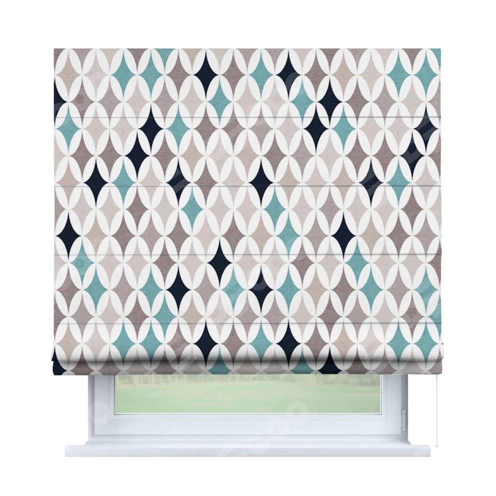 Римская штора производителя «Cortin», используется для проёма, пошита из ткани блэкаут с нанесением сублимационной печати «Орнамент кристалл». Имеет универсальный механизм и подходит для монтажа: на потолок, на стену и в нишу.