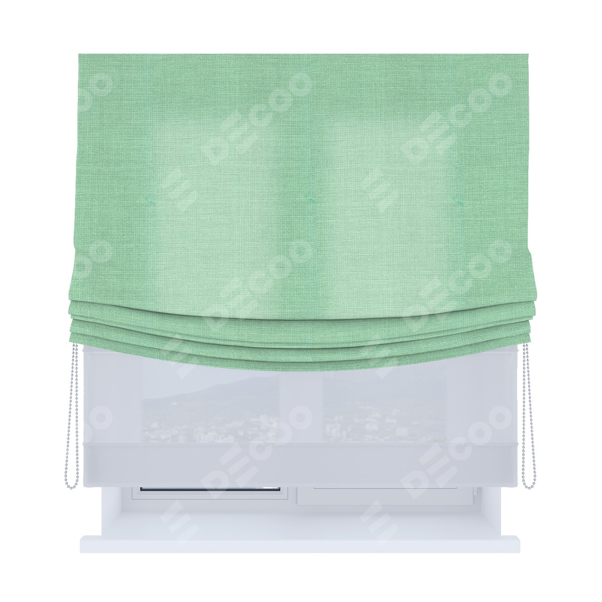 Римская штора день-ночь (двойная) от производителя «Cortin», используется для проёма. Пошита из двух полотен, основная ткань лён светло-бирюзовый артикул 74737, вторая ткань тюль (по стандарту используется тюль белого цвета артикул V-01). Имеет универсальный механизм и подходит для монтажа: на потолок, на стену и в нишу. Удобное управление каждой шторой отдельно.