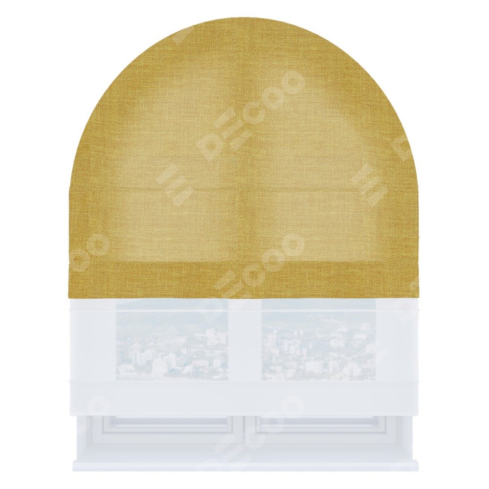 Римская штора день-ночь производителя «Cortin», используется для арочного проёма, пошита из двух полотен, с лицевой стороны лён горчичный артикул 74740, вторая ткань тюль (по стандарту комплектуется тюль белого цвета артикул V-01). Штора шьётся по индивидуальным размерам, для данного типа римской шторы возможная ширина от 60 до 300 см. Удобное управление каждой шторой отдельно.