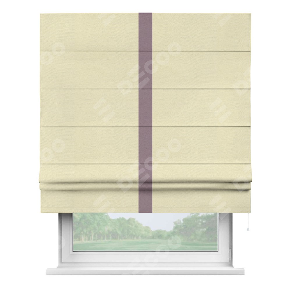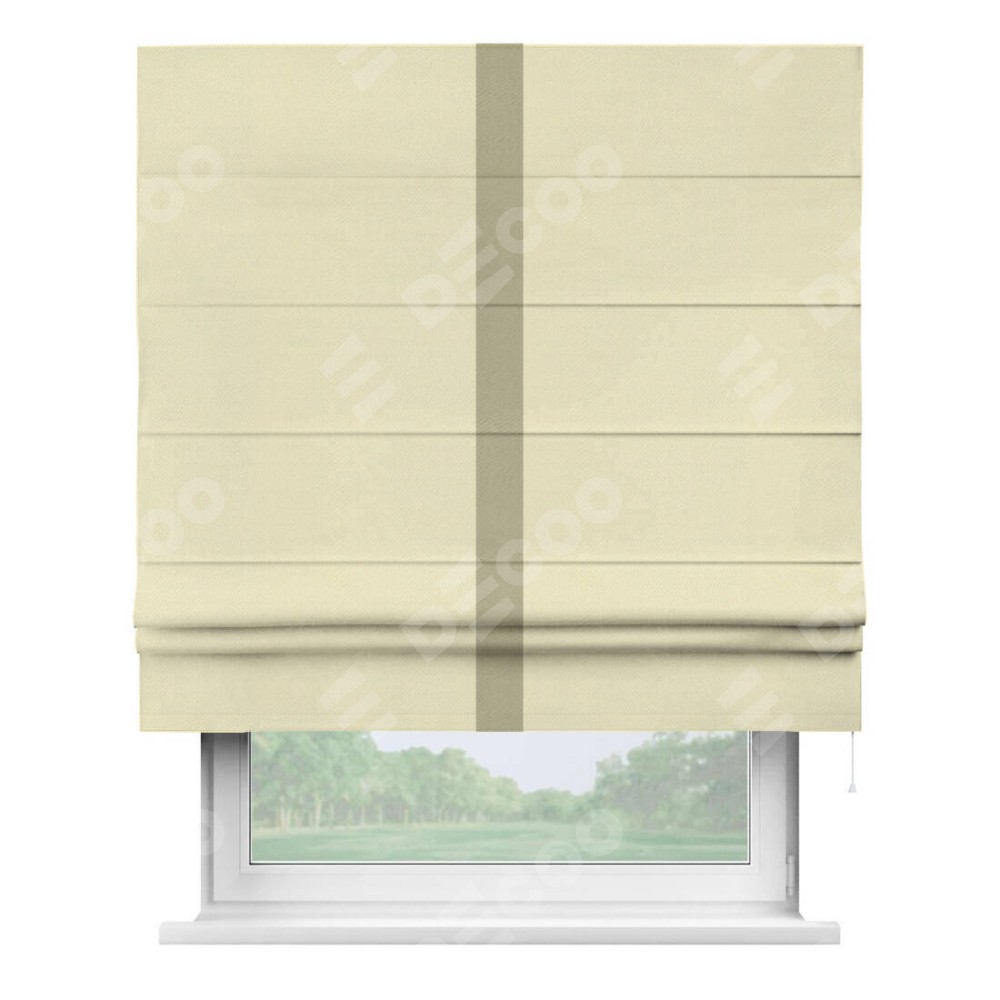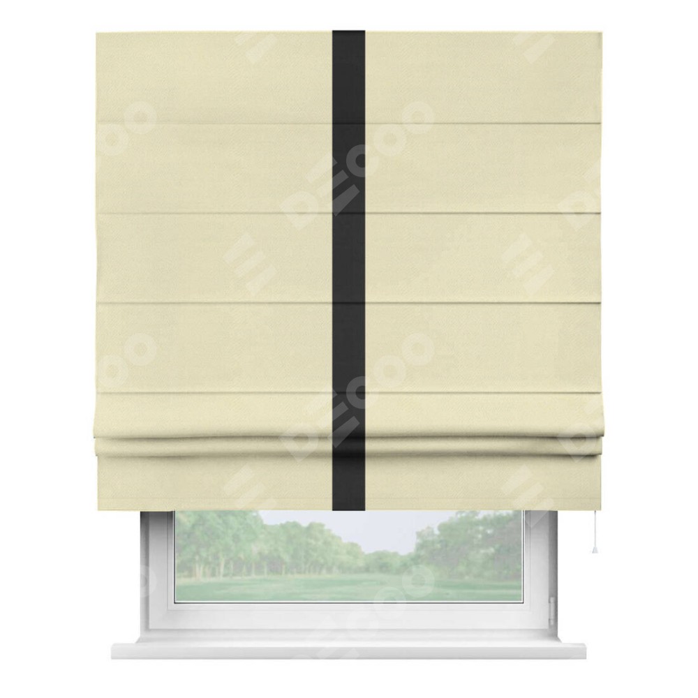Римская штора производителя «Cortin», используется для проёма, пошита из ткани блэкаут однотонный бежевый, артикул ткани 88283. Отделка шторы кантом «Хайвей», ткань для канта используется из блэкаута однотонного разной расцветки на выбор. Имеет универсальный механизм и подходит для монтажа: на потолок, на стену и в нишу.