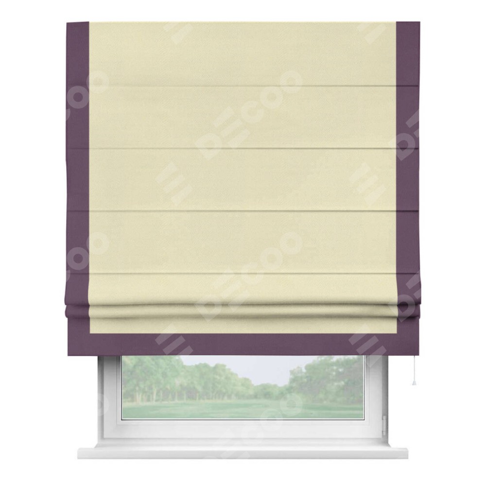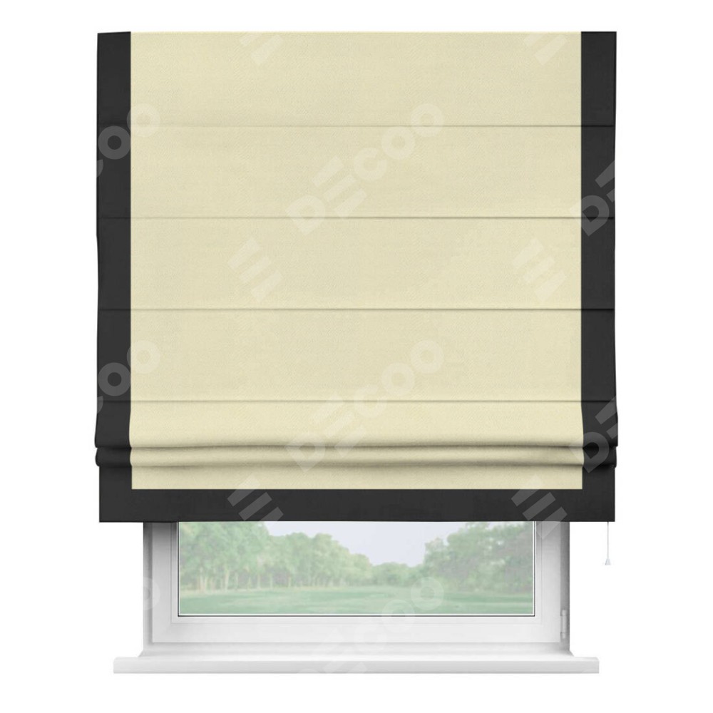 Римская штора производителя «Cortin», используется для проёма, пошита из ткани блэкаут однотонный бежевый, артикул ткани 88283. Отделка шторы кантом «Виктория», ткань для канта используется из блэкаута однотонного разной расцветки на выбор. Имеет универсальный механизм и подходит для монтажа: на потолок, на стену и в нишу.