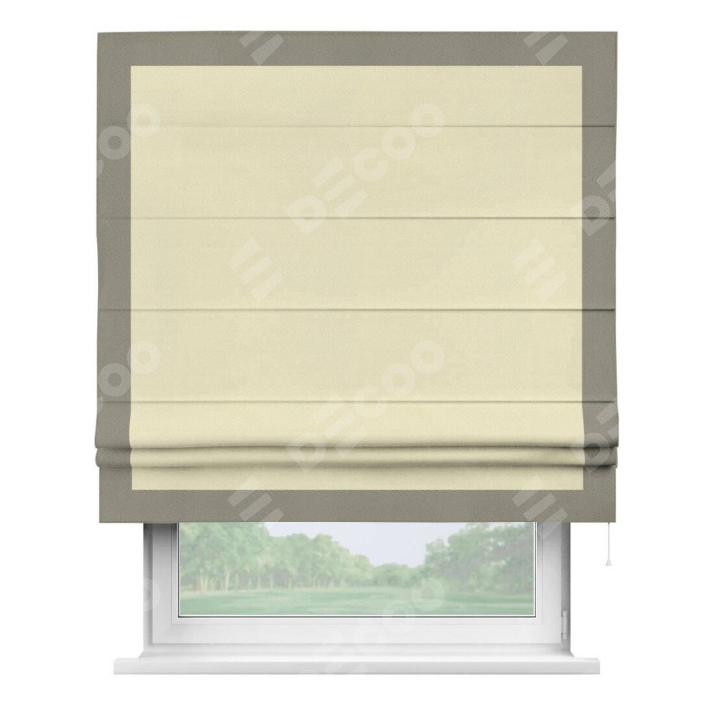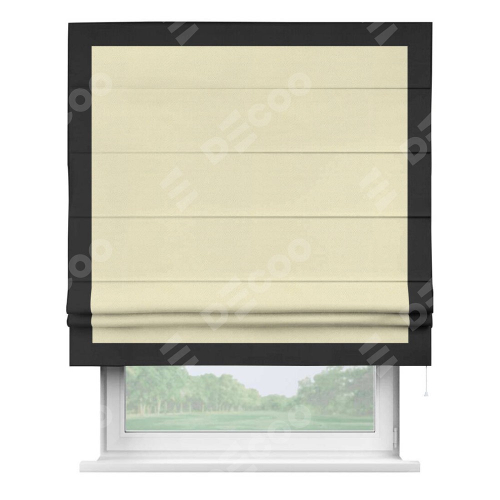 Римская штора производителя «Cortin», используется для проёма, пошита из ткани блэкаут однотонный бежевый, артикул ткани 88283. Отделка шторы кантом «Чесс», ткань для канта используется из блэкаута однотонного разной расцветки на выбор. Имеет универсальный механизм и подходит для монтажа: на потолок, на стену и в нишу.