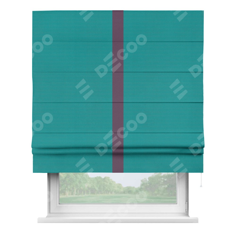 Римская штора производителя «Cortin», используется для проёма, пошита из ткани блэкаут однотонный бирюзовый, артикул ткани 88297. Отделка шторы кантом «Хайвей», ткань для канта используется из блэкаута однотонного разной расцветки на выбор. Имеет универсальный механизм и подходит для монтажа: на потолок, на стену и в нишу.