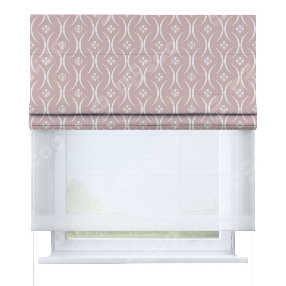 Римская штора день-ночь производителя «Cortin», используется для проёма, пошита из двух полотен, с лицевой блэкаут с нанесением сублимационной печати «Воздушный узор бежевый», вторая ткань тюль (по стандарту комплектуется тюль белого цвета артикул V-01). Имеет универсальный механизм и подходит для монтажа: на потолок, на стену и в нишу.