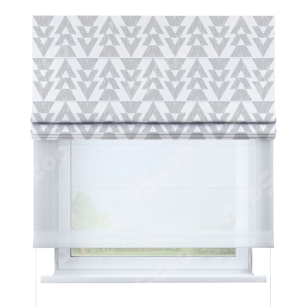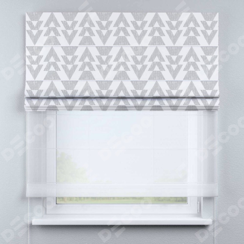 Римская штора день-ночь производителя «Cortin», используется для проёма, пошита из двух полотен, с лицевой блэкаут с нанесением сублимационной печати «Серые стрелки», вторая ткань тюль (по стандарту комплектуется тюль белого цвета артикул V-01). Имеет универсальный механизм и подходит для монтажа: на потолок, на стену и в нишу.