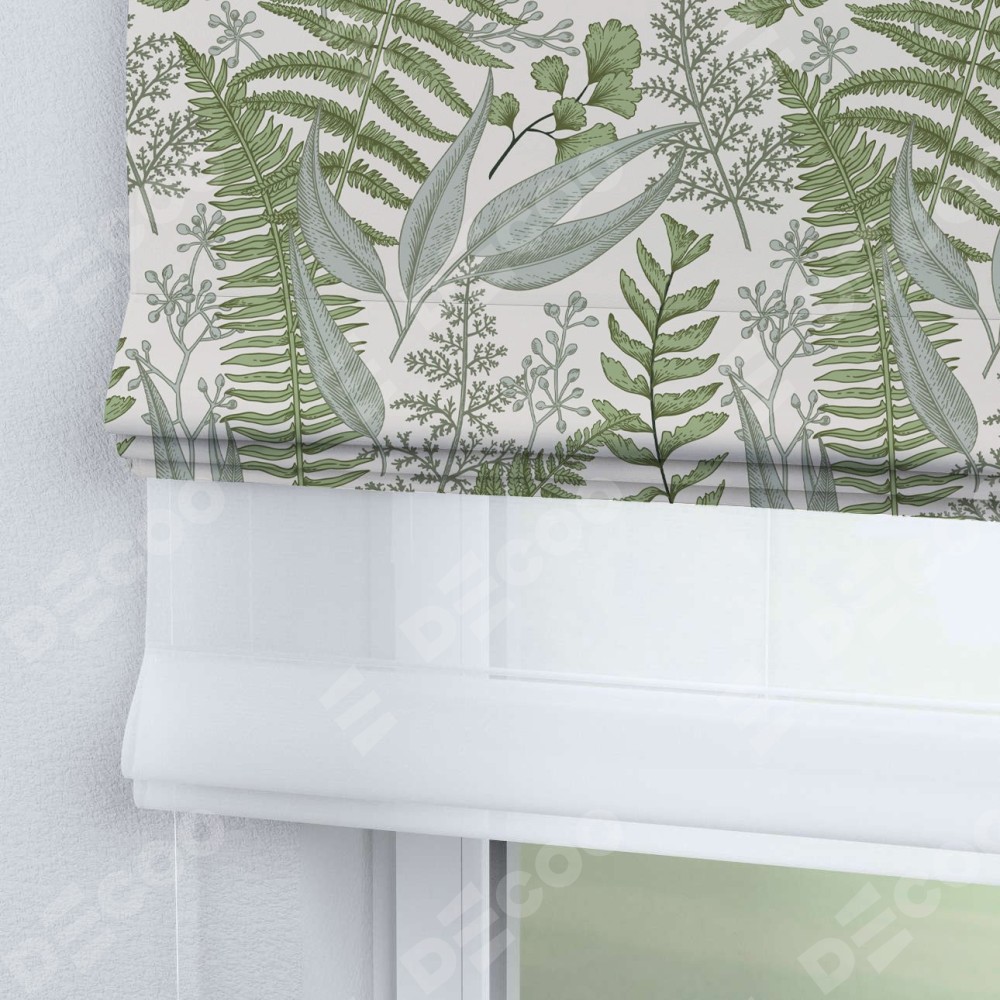 Римская штора день-ночь производителя «Cortin», используется для проёма, пошита из двух полотен, с лицевой блэкаут с нанесением сублимационной печати «Тенистый лес», вторая ткань тюль (по стандарту комплектуется тюль белого цвета артикул V-01). Имеет универсальный механизм и подходит для монтажа: на потолок, на стену и в нишу.