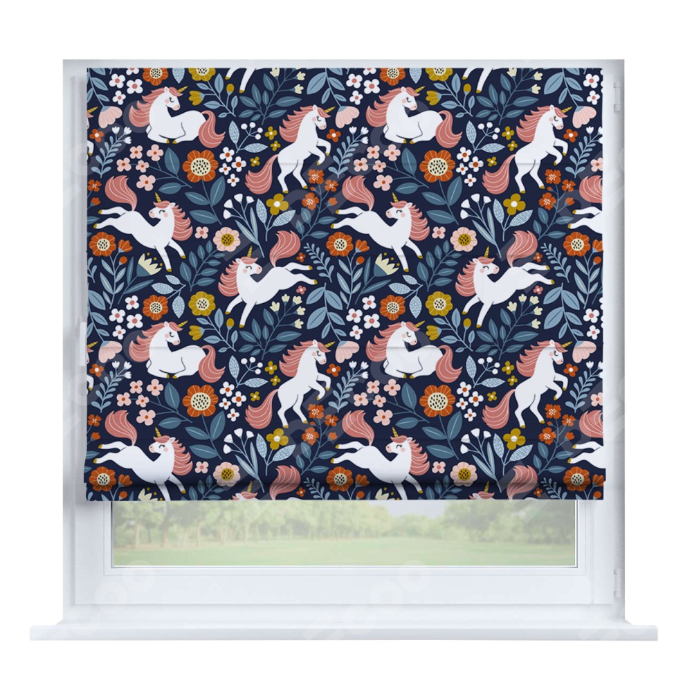Римская штора производителя «Cortin», устанавливается на створку окна, пошита из ткани блэкаут с нанесением сублимационной печати «Цветы и единороги». Штора шьётся по индивидуальным размерам, для данного типа римской шторы возможная ширина от 35 до 150 см., высота до 250 см.