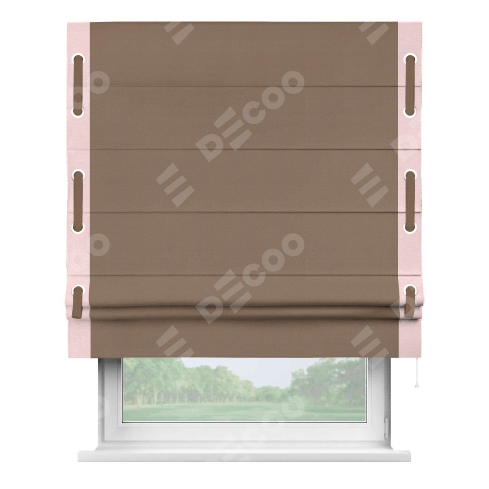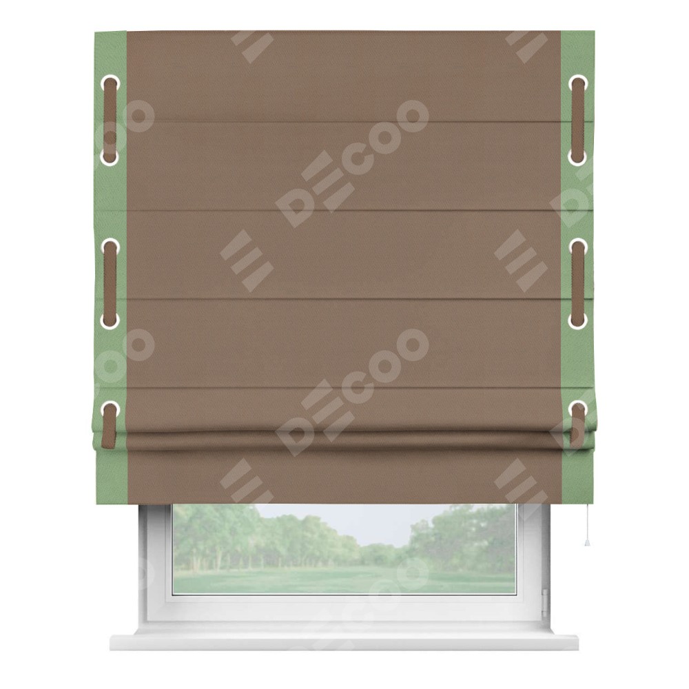 Римская штора производителя «Cortin», используется для проёма, пошита из ткани блэкаут однотонный коричневый, артикул ткани 88285. Отделка шторы кантом «Стрим Дуо» на кантах расположены люверсы с пояском, ткань для канта используется из блэкаута однотонного разной расцветки на выбор. Ткань для пояска обычно используется из основной ткани шторы, а так же можно сделать из любой расцветки по желанию. Имеет универсальный механизм и подходит для монтажа: на потолок, на стену и в нишу.