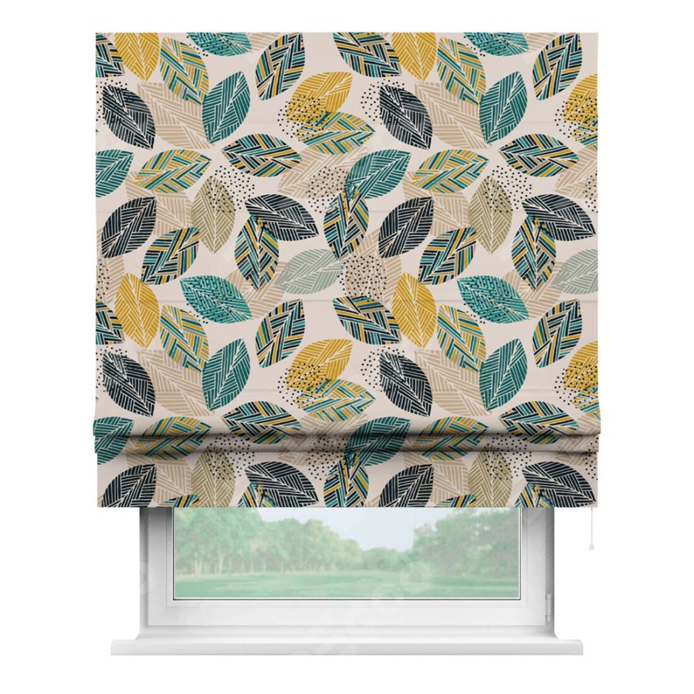 Римская штора производителя «Cortin», используется для проёма, пошита из ткани блэкаут с нанесением сублимационной печати «Листья с орнаментом». Имеет универсальный механизм и подходит для монтажа: на потолок, на стену и в нишу.