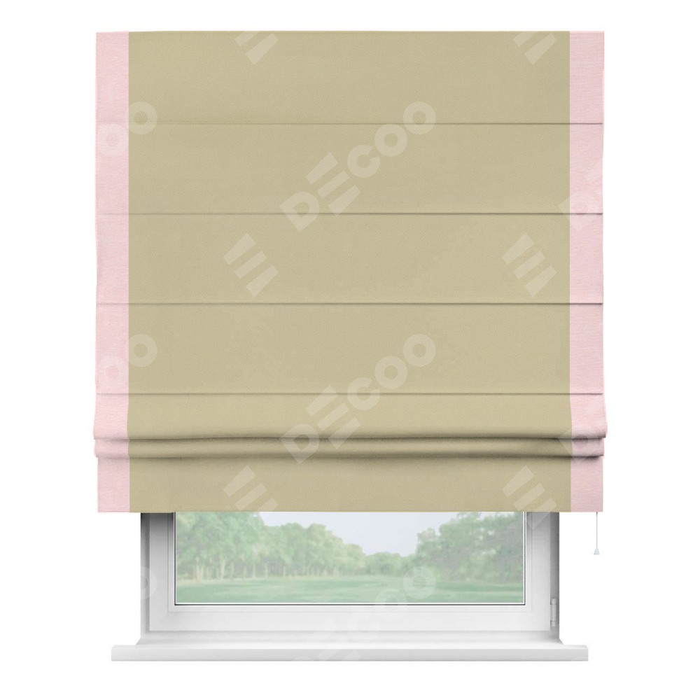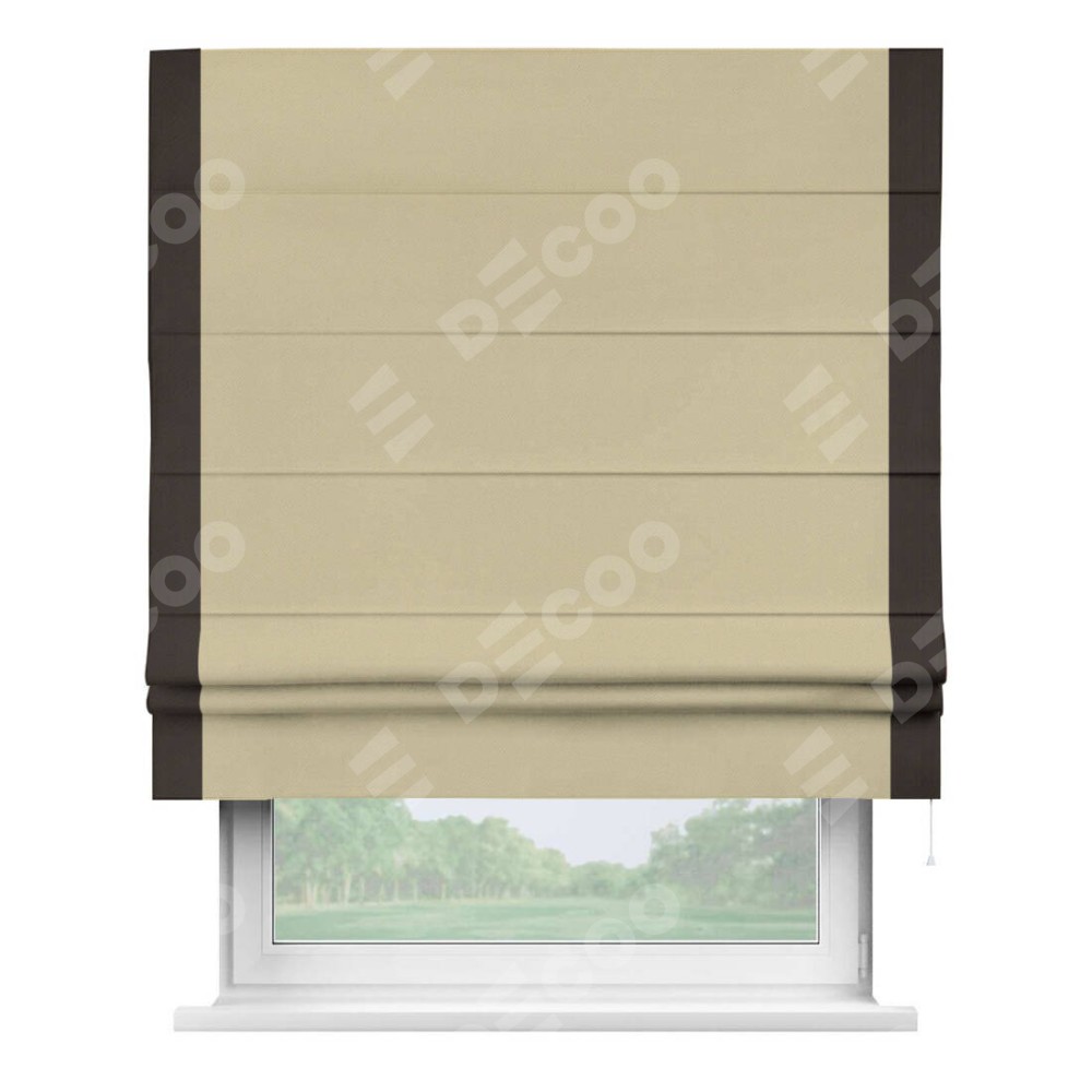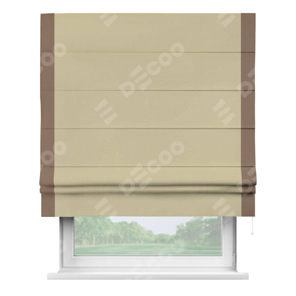 Римская штора производителя «Cortin», используется для проёма, пошита из ткани блэкаут однотонный кофейный, артикул ткани 13130. Отделка шторы кантом «Стрим Дуо», ткань для канта используется из блэкаута однотонного разной расцветки на выбор. Имеет универсальный механизм и подходит для монтажа: на потолок, на стену и в нишу.