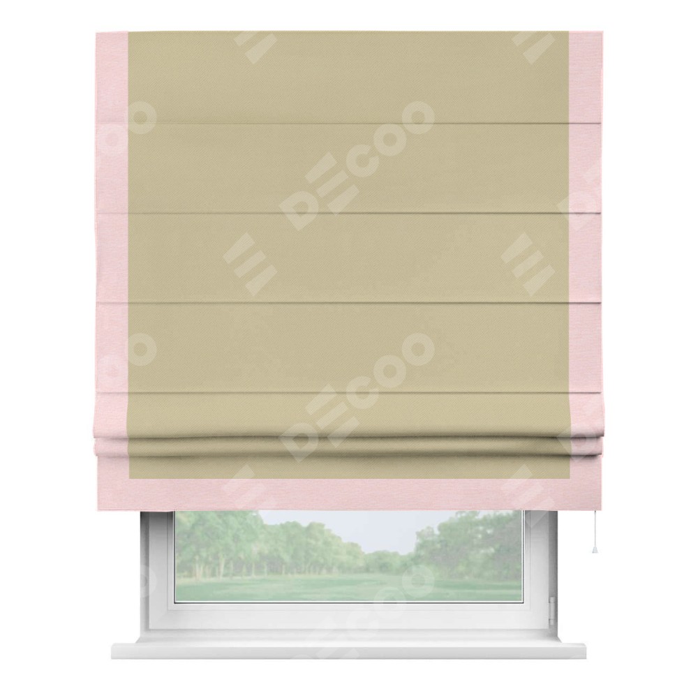 Римская штора производителя «Cortin», используется для проёма, пошита из ткани блэкаут однотонный кофейный, артикул ткани 13130. Отделка шторы кантом «Виктория», ткань для канта используется из блэкаута однотонного разной расцветки на выбор. Имеет универсальный механизм и подходит для монтажа: на потолок, на стену и в нишу.