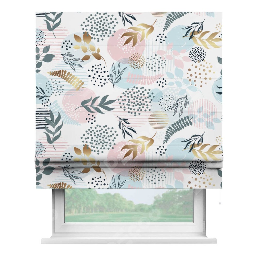Римская штора производителя «Cortin», используется для проёма, пошита из ткани блэкаут с нанесением сублимационной печати «Точки и листочки». Имеет универсальный механизм и подходит для монтажа: на потолок, на стену и в нишу.
