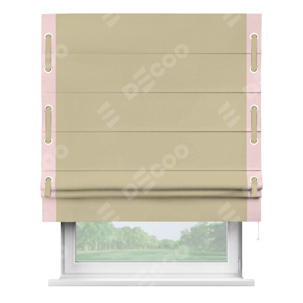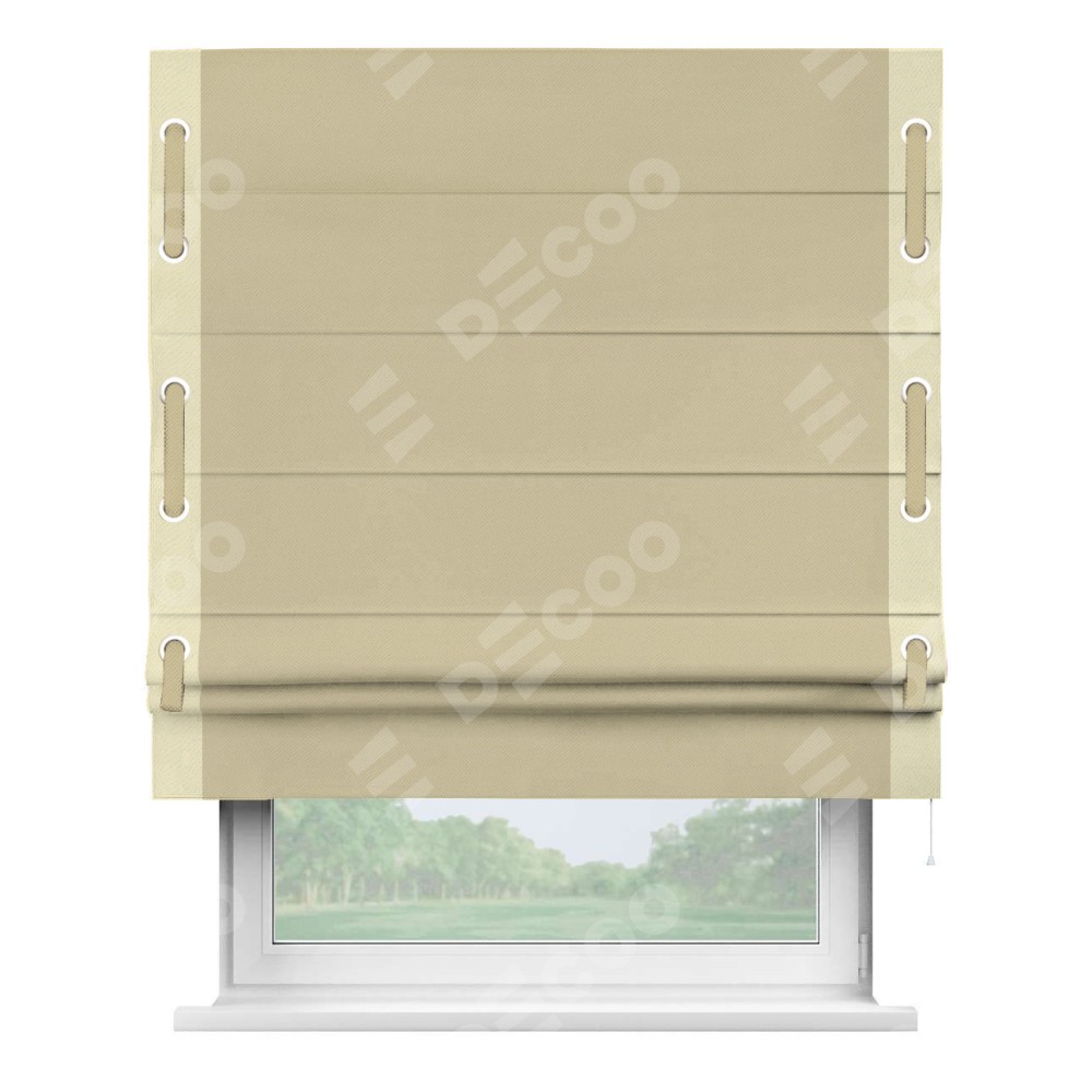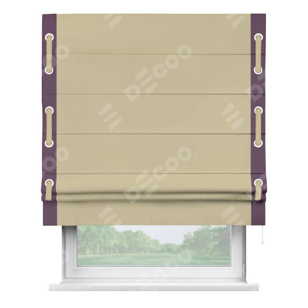 Римская штора производителя «Cortin», используется для проёма, пошита из ткани блэкаут однотонный кофейный, артикул ткани 13130. Отделка шторы кантом «Стрим Дуо» на кантах расположены люверсы с пояском, ткань для канта используется из блэкаута однотонного разной расцветки на выбор. Ткань для пояска обычно используется из основной ткани шторы, а так же можно сделать из любой расцветки по желанию. Имеет универсальный механизм и подходит для монтажа: на потолок, на стену и в нишу.