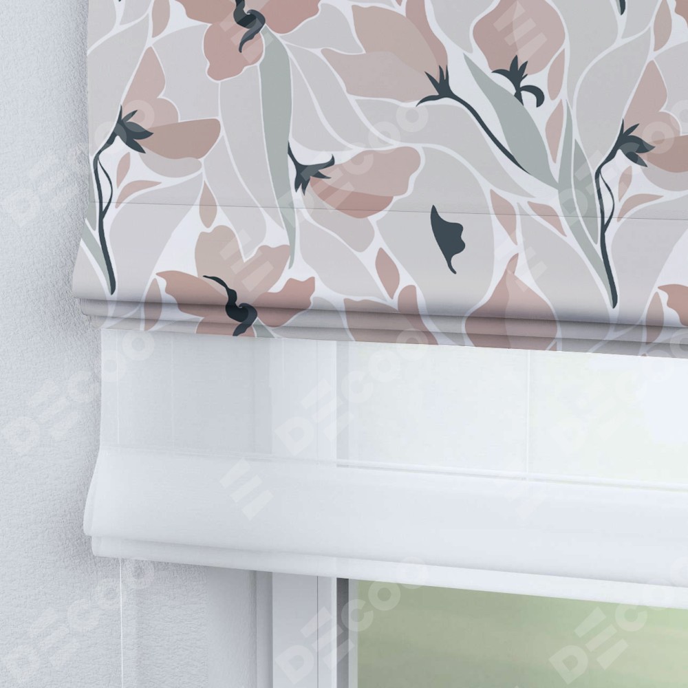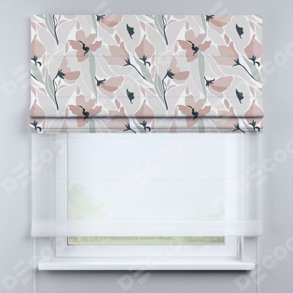 Римская штора день-ночь производителя «Cortin», используется для проёма, пошита из двух полотен, с лицевой блэкаут с нанесением сублимационной печати «Тюльпаны пастель», вторая ткань тюль (по стандарту комплектуется тюль белого цвета артикул V-01). Имеет универсальный механизм и подходит для монтажа: на потолок, на стену и в нишу.