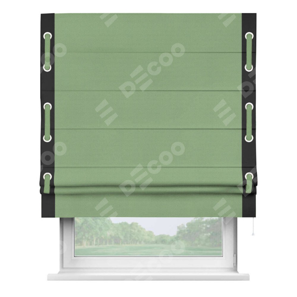 Римская штора производителя «Cortin», используется для проёма, пошита из ткани блэкаут однотонный оливковый, артикул ткани 88300. Отделка шторы кантом «Стрим Дуо» на кантах расположены люверсы с пояском, ткань для канта используется из блэкаута однотонного разной расцветки на выбор. Ткань для пояска обычно используется из основной ткани шторы, а так же можно сделать из любой расцветки по желанию. Имеет универсальный механизм и подходит для монтажа: на потолок, на стену и в нишу.
