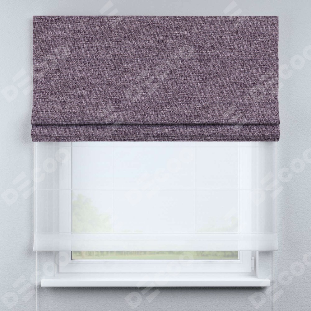 Римская штора день-ночь производителя «Cortin», используется для проёма, пошита из двух полотен, с лицевой стороны лён кашемир фиолетовый артикул 17211, вторая ткань тюль (по стандарту комплектуется тюль белого цвета артикул V-01). Имеет универсальный механизм и подходит для монтажа: на потолок, на стену и в нишу.