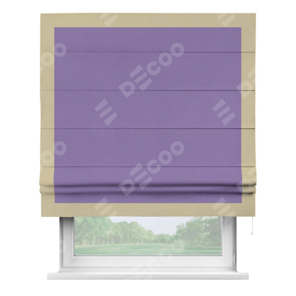 Римская штора производителя «Cortin», используется для проёма, пошита из ткани блэкаут однотонный сиреневый, артикул ткани 88305. Отделка шторы кантом «Чесс», ткань для канта используется из блэкаута однотонного разной расцветки на выбор. Имеет универсальный механизм и подходит для монтажа: на потолок, на стену и в нишу.