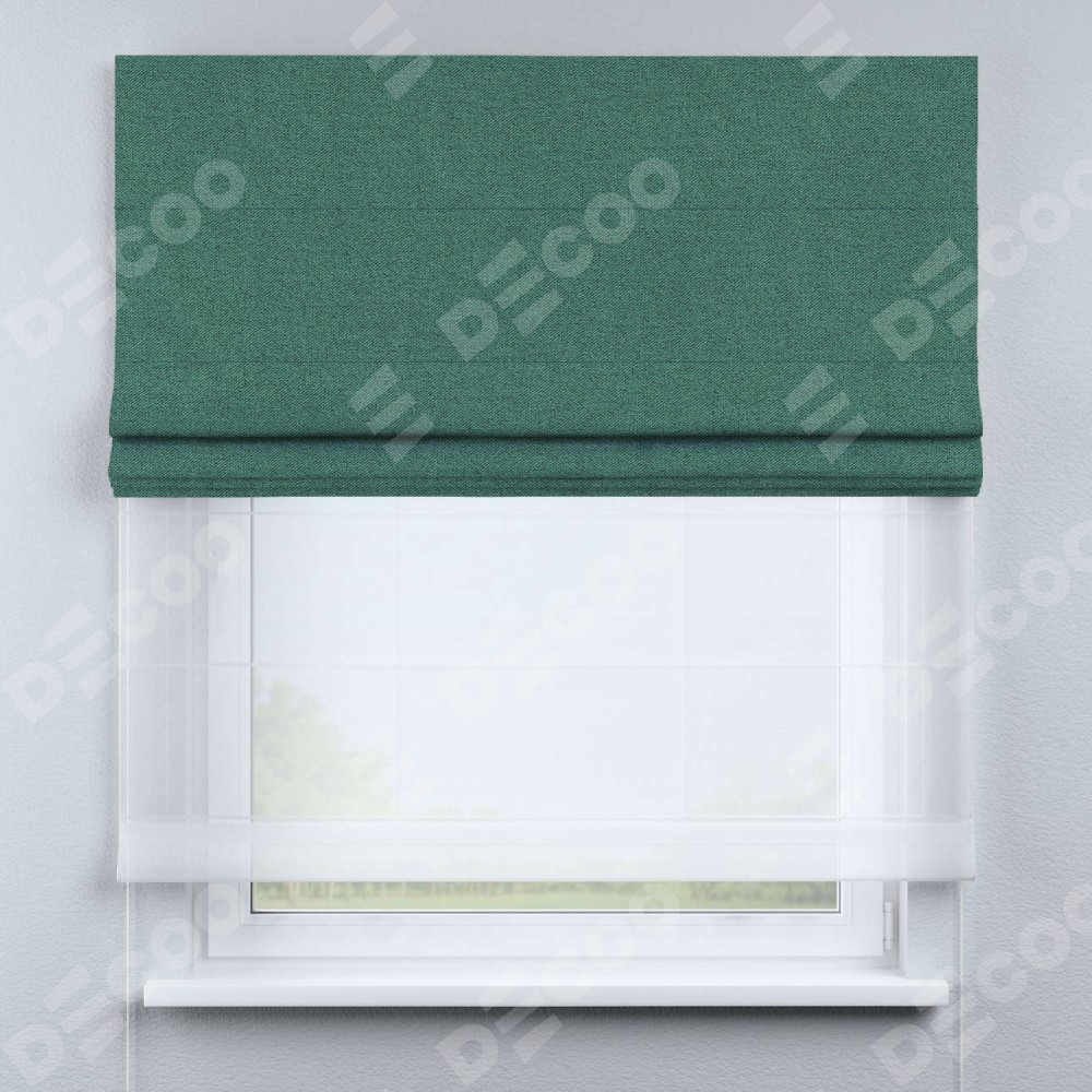 Римская штора день-ночь производителя «Cortin», используется для проёма, пошита из двух полотен, с лицевой стороны лён блэкаут бирюзовый артикул 69517, вторая ткань тюль (по стандарту комплектуется тюль белого цвета артикул V-01). Имеет универсальный механизм и подходит для монтажа: на потолок, на стену и в нишу.