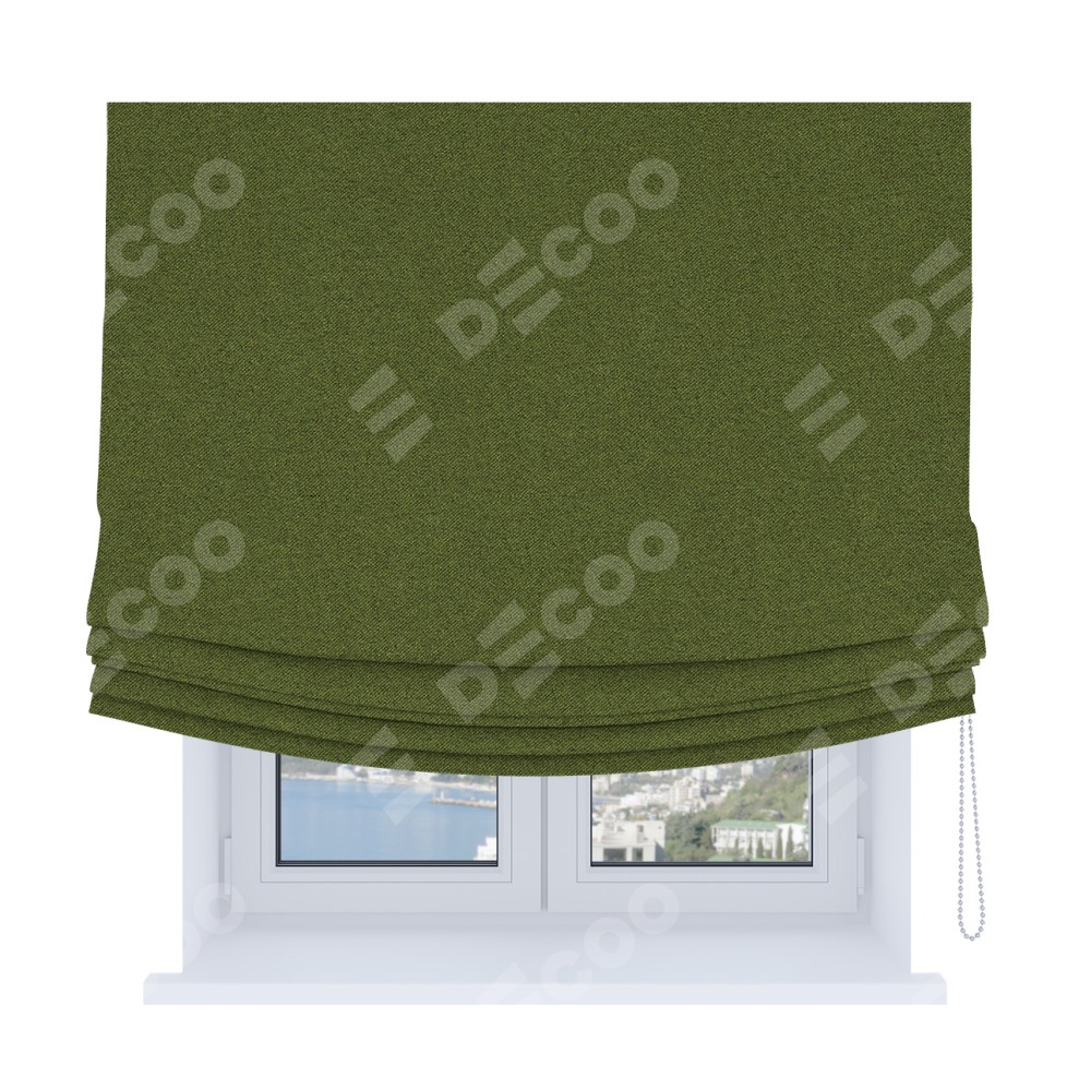 Римская штора Soft производителя «Cortin», используется для проёма, пошита из ткани лён блэкаут оливковый, артикул ткани 69516. Имеет универсальный механизм и подходит для монтажа: на потолок, на стену и в нишу. В отличие от стандартных римских штор, римская штора Soft не имеет горизонтальных вставок и нижнего отвеса. Это позволяет ткани произвольно драпироваться в свободные мягкие складки.
